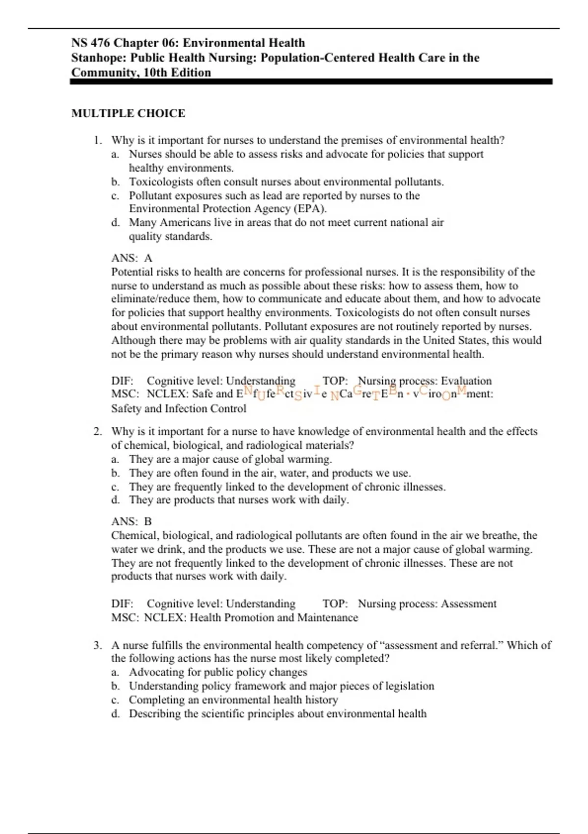 NS 476 Chapter 06: Environmental Health Stanhope: Public Health Nursing: Population-Centered Health Care in the Community, 10th Edition MULTIPLE CHOICE 1. Why is it important for nurses to understand the premises of environmental health? a. Nurses should be able to assess risks and advocate for policies that support healthy environments. b. Toxicologists often consult nurses about environmental pollutants. c. Pollutant exposures such as lead are reported by nurses to the Environmental Protection Agency (EPA). d. Many Americans live in areas that do not meet current national air quality standards. ANS: A