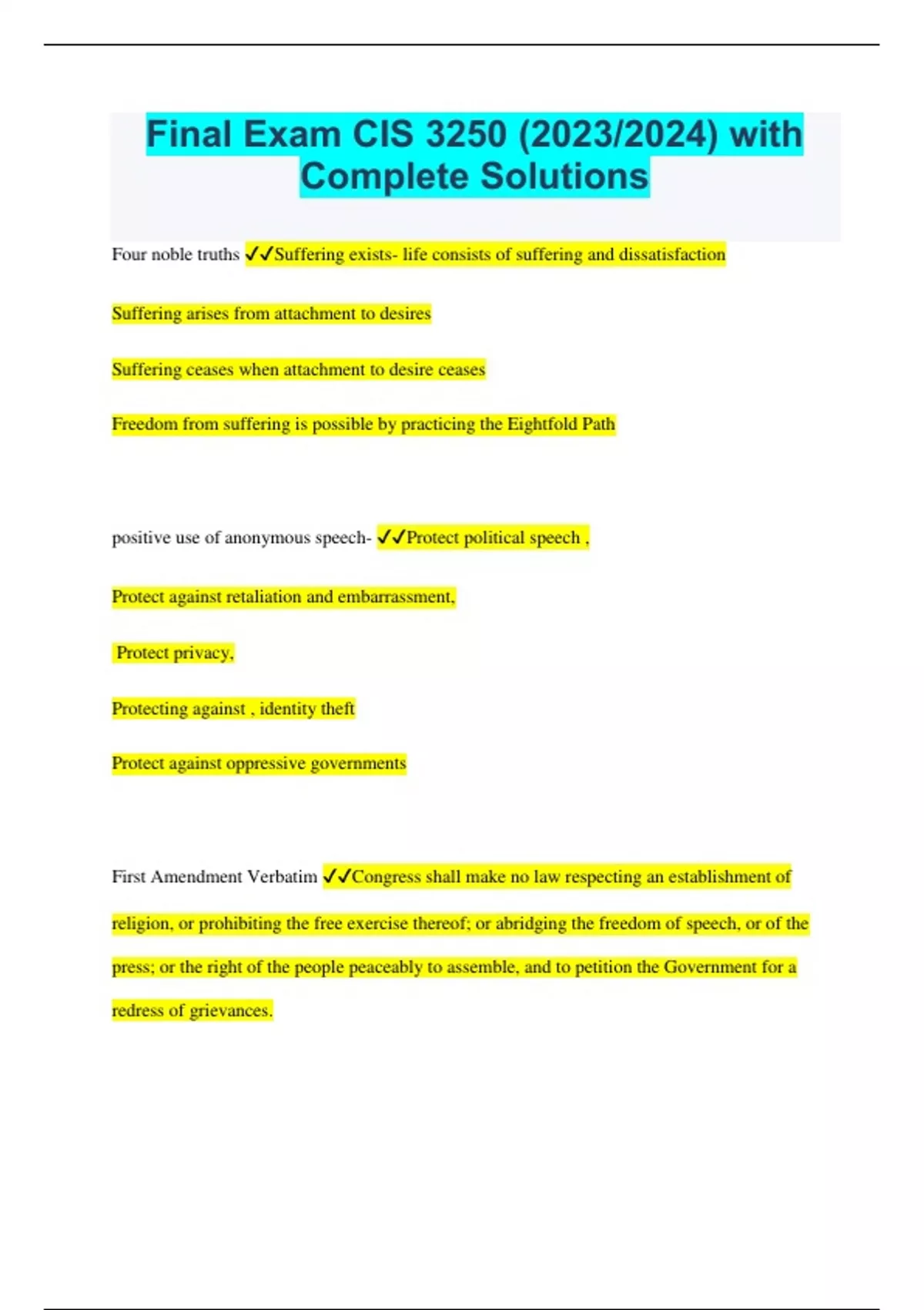 Final Exam CIS 3250 (2023/2024) with Complete Solutions Four noble truths Suffering exists- life consists of suffering and dissatisfaction Suffering arises from attachment to desires Suffering ceases when attachment to desire ceases Freedom from suffering is possible by practicing the Eightfold Path positive use of anonymous speech- Protect political speech , Protect against retaliation and embarrassment, Protect privacy, Protecting against , identity theft Protect against oppressive governments First Amendment Verbatim Congress shall make no law respecting an establishment of religion, or prohibiting the free exercise thereof; or abridging the freedom of speech, or of the press; or the right of the people peaceably to assemble, and to petition the Government for a redress of grievances. Amazon used kill switches to do what? Allow a remote entity to disable applications and delete files. To remove a book that violated copy right laws. Name a job that has changed drasitically from the introduction of the computer Bowling ball pinsetter this job has become completely obsolete Impact of cellphones on society Smartphones serve as electronic wallets and identification cards at store terminals or security checkpoints. Phones monitor security cameras at home or control home appliances from a distance How free services are paid for on the internet- In order for companies to earn ad revenue to fund multimillion-dollar services, many free sites collect information about our online activities and sell it to advertisers. Golden Rule Do un to others as those would have done un to you. Negative uses of social media- Stalkers and bullies stalk and bully.Jurors tweet about court cases during trials Socialbots simulate humans. Deontological We should follow rules of behavior that we can universally apply to everyone. logic or reason determines rules of ethical behavior Utilitarian A system of ethics according to which the rightness or wrongness of an action should be judged by its consequences. The goal of utilitarian ethics is to promote the greatest happiness for the greatest number. Natural rights that respects a set of fundamental rights of others, including the rights to life, liberty, and property Negative rights- Negative rights, or liberties, are rights to act without interference. The only obligationthey impose on others is not to prevent you from acting. the right to be free from assault, the right to use rty, the right to use your labor, skills, and mind to create goods and services and to trade with other people in voluntary exchanges. Positive rights- Claim rights, or positive rights, impose an obligation on some people to provide certain things for others. A positive right to a job means that someone must hire you regardless of whether they voluntarily choose to, or that it is right. Cookies Files a Web site stores on a visitor's c Cookies - Files a Web site stores on a visitor's computer. Which media has the most protection under the 1st amendment- print Threats from new technology- Digital technology and the Internet make copyright infringement easier and cheaper. New compression technologies make copying large files (e.g. graphics, video and audio files) feasible. Search engines make finding material easier. Peer-to-peer technology makes transferring and sharing files easier. Miniaturization of cameras and other equipment enable audience members to record and transmit events. Scanners allow us to change the media of a copyrighted work, converting printed text, photos, and artwork to electronic form. New tools allow us to modify graphics, video and audio files to make derivative works. California supreme court on seizure of cellphones case holding that police are not required to obtain a warrant to search information contained within a cell phone in a lawful arrest. Ohio supreme court decision on seizure of cellphones ruled that a warrant is needed to search the info contained within a cellphone in a lawful arrest. Olmstead V United States in 1928, the government had used wiretaps on telephone lines without a court order. The Supreme Court allowed the wiretaps. It interpreted the Fourth Amendment to apply only to physical intrusion and only to the search or seizure of material things, not conversations Miller V. California- is a landmark United States Supreme Court case in which the Court unanimously held that the warrantless search and seizure of digital contents of a cell phone during an arrest is unconstitutional. USA patriot Act eroded the 4th amendment Communications Decency Act of 1996 (CDA) -Attempted to avoid conflict with First Amendment by focusing on childrenMade it a crime to make available to anyone under 18 any obscene or indecent communication The CDA of 1996 result Found unconstitutional- The worst material threatening children was already illegal was too vague and broad. It did not use the least restrictive means of accomplishing the goal of protecting children. i.e reduced the internet only something that could be viewed by children. And watered down the content. Filtering software was found to be far less restrictive. Child Online Protection Act of 1998 (COPA)More limited than CDA. Federal crime for commercial Web sites to make available to minors material "harmful to minors" as judged by community standards. Found to be unconstitutional- It was too broad would restrict the entire country to the standards of the most conservative community. It would have a chilling effect. Would threaten, art news and health sites. CIPA 2000 requires schools and libraries that participate in certain federal programs to install filtering software. What is considered SPAM- unsolicited bulk email. text messages, tweets, and phone calls. California had a law banned sale of rental of video games to minors in 2011- The California Supreme Court ruled that "disgust is not a valid basis for restricting expression." What is not an impact that technology has had on Employment- technology doesn't c
