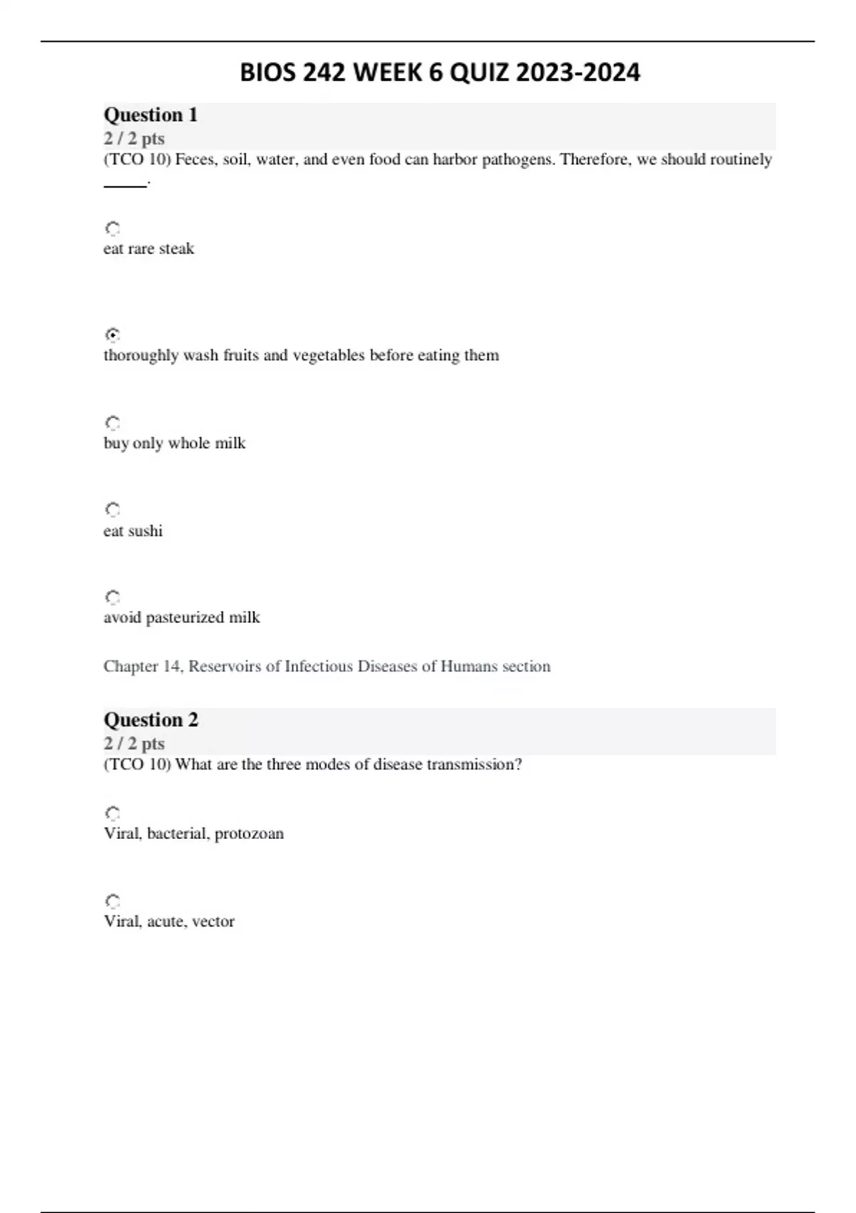 BIOS 242 WEEK 6 QUIZ (TCO 10) Feces, soil, water, and even food can harbor pathogens. Therefore, we should routinely . eat rare steak thoroughly wash fruits and vegetables before eating them buy only whole milk eat sushi avoid pasteurized milk Chapter 14, Reservoirs of Infectious Diseases of Humans section (TCO 10) What are the three modes of disease transmission? Viral, bacterial, protozoan Viral, acute, vector Question 1 2 / 2 pts Question 2 2 / 2 pts Vector, vehicle, contact Bacterial, viral, plasmoidal Latent, viral, systemic Chapter 14, Modes of Infectious Disease Transmission section (TCO 10) Last year, 4,022 new cases of the flu were admitted into the County Hospital. This statement tells us the disease’s . virulence epidemiology incidence prevalence None of the above Chapter 14, Epidemiology of Infectious Diseases section Question 3 2 / 2 pts (TCO 10) Pathogens may cross the placental membranes and . cause infection of embryo or fetus cause birth defects cause premature birth cause spontaneous abortion (miscarriage) All of the above Chapter 14, The Movement of Microbes into Hosts: Infection section (TCO 10) A disease that is continually and normally found in an area is described as . vectoral sporadic Question 4 2 / 2 pts Question 5 2 / 2 pts pandemic epidemic endem