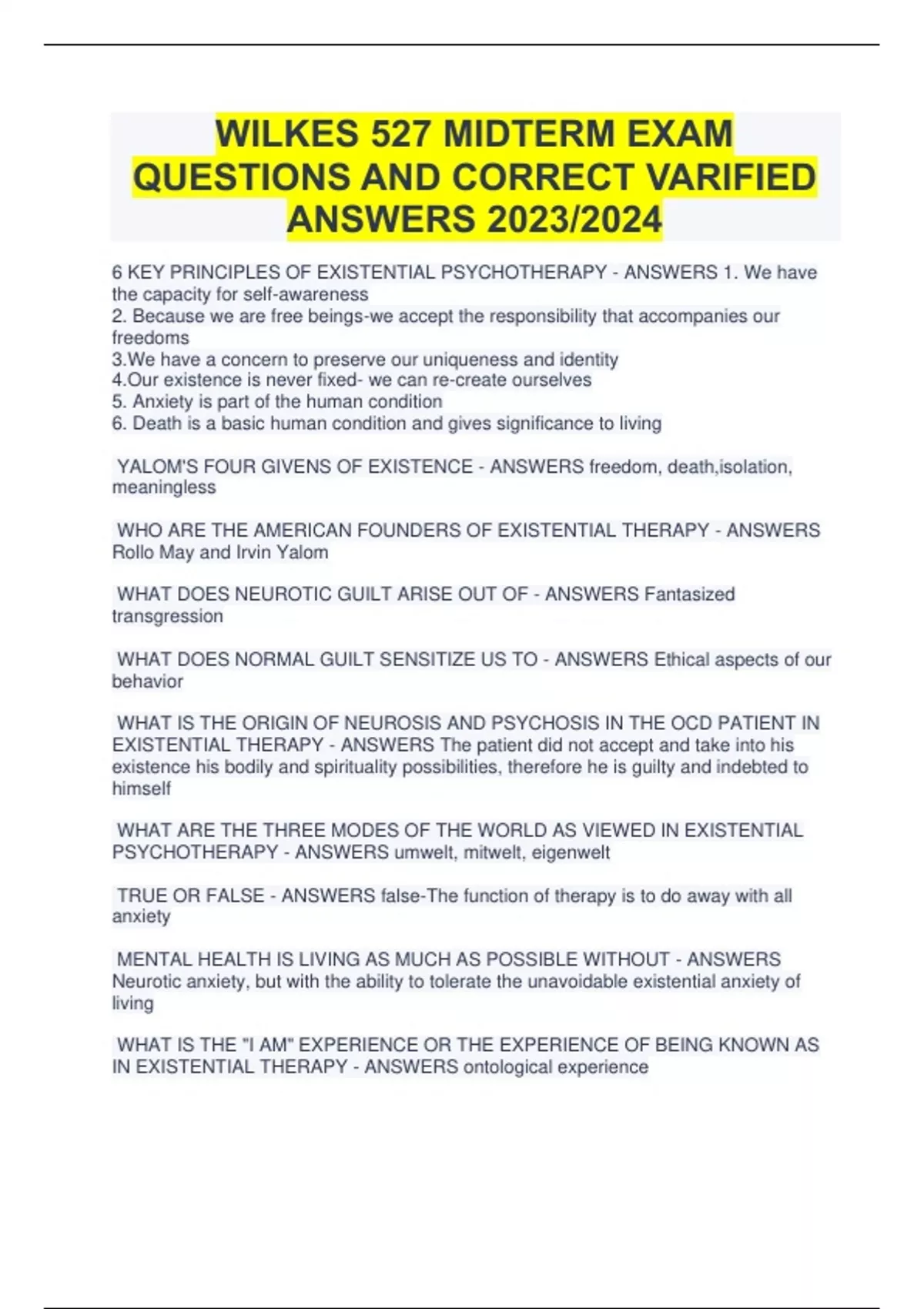 WILKES 527 MIDTERM EXAM QUESTIONS AND CORRECT VARIFIED ANSWERS 2023/2024 6 KEY PRINCIPLES OF EXISTENTIAL PSYCHOTHERAPY - ANSWERS 1. We have the capacity for self-awareness 2. Because we are free beings-we accept the responsibility that accompanies our freedoms 3.We have a concern to preserve our uniqueness and identity 4.Our existence is never fixed- we can re-create ourselves 5. Anxiety is part of the human condition 6. Death is a basic human condition and gives significance to living YALOM'S FOUR GIVENS OF EXISTENCE - ANSWERS freedom, death,isolation, meaningless WHO ARE THE AMERICAN FOUNDERS OF EXISTENTIAL THERAPY - ANSWERS Rollo May and Irvin Yalom WHAT DOES NEUROTIC GUILT ARISE OUT OF - ANSWERS Fantasized transgression WHAT DOES NORMAL GUILT SENSITIZE US TO - ANSWERS Ethical aspects of our behavior WHAT IS THE ORIGIN OF NEUROSIS AND PSYCHOSIS IN THE OCD PATIENT IN EXISTENTIAL THERAPY - ANSWERS The patient did not accept and take into his existence his bodily and spirituality possibilities, therefore he is guilty and indebted to himself WHAT ARE THE THREE MODES OF THE WORLD AS VIEWED IN EXISTENTIAL PSYCHOTHERAPY - ANSWERS umwelt, mitwelt, eigenwelt TRUE OR FALSE - ANSWERS false-The function of therapy is to do away with all anxiety MENTAL HEALTH IS LIVING AS MUCH AS POSSIBLE WITHOUT - ANSWERS Neurotic anxiety, but with the ability to tolerate the unavoidable existential anxiety of living WHAT IS THE "I AM" EXPERIENCE OR THE EXPERIENCE OF BEING KNOWN AS IN EXISTENTIAL THERAPY - ANSWERS ontological experience THE "SCIENCE OF BEING" - ANSWERS Existential therapy A CORE EXISTENCE CONFLICT IS THE TENSION BETWEEN THE AWARENESS OF THE INEVITABILILITY OF DEATH AND THE WISH TO CONTINUE TO BE - ANSWERS Death WHAT DOES FREEDOM FROM EXISTENTIAL PERSPECTIVE REFER TO - ANSWERS The complete lack of any external structure to life 3 CHARACTERISTICS OF NORMAL ANXIETY - ANSWERS -proportionate to the situation confronted -does not require repression -can be used creatively AN EXAMPLE OF NEUROTIC ANXIETY - ANSWERS a parent that is so anxious that their child will be hit by a car, never lets the child leave the house NEUROTIC ANXIETY - ANSWERS Tends to paralyze the individual and is destructive A CORE EXISTENTIAL CONFLICT THAT IS THE TENSION BETWEEN THE AWARENESS OF THE INEVITABILITY OF DEATH AND THE WISH TO CONTINUE TO BE - ANSWERS Death WHAT DID YALOM BELIEVE ABOUT FREEDOM AND RESPONSIBILITY - ANSWERS That there is a conflict between the groundlessness and randomness of our universe, and a wish for WHICH "GIVENS" OF EXISTENCE IS THIS: WE ENTER THE WORLD ALONE AND WE MUST LEAVE IT ALONE - ANSWERS Isolation YALOM BELIEVED THAT ANOTHER EXISTENTIAL CONFLICT WAS BETWEEN OUR AWARENESS OF OUR ISOLATION AND OUR DESIRE FOR CONTINUED CONTACT WITH OTHERS AND NEED TO BE OF A LARGER WHOLE - ANSWERS isolation MAN IS BY DESIGN WHAT: - ANSWERS a meaning seeking creature WE ENTER THIS WORLD ALONE, AND WE MUST LEAVE IT ALONE - ANSWERS isolation THIS FORM OF THE WORLD INCLUDES BIOLOGICAL NEEDS, DRIVES, AND INSTINCTS - ANSWERS Umwelt RELATIONSHIP TO ONESELF, INCLUDING SELF-AWARENESS - ANSWERS Eigenwelt MITWELT MEANING - ANSWERS The world of one's fellow human beings WHAT "FORM OF THE WORLD" IS THE SAYING TALKING ABOUT: "THIS FLOWER IS BEAUTIFUL".....MEANS "FOR ME, THIS FLOWER IS BEAUTIFUL" - ANSWERS Eigenwelt WHICH FORMS OF THE WORLD REFERS TO: "THE RELATIONSHIP WITH OURSELVES" - ANSWERS Eigenwelt ANXIETY ARISES FROM - ANSWERS Our personal need to survive and preserve our being WHAT IS THE STATE OF BEING OR EXISTENCE ABOVE AND BEYOND THE LIMITS OF MATERNAL EXPERIENCE - ANSWERS Transcendence CONCERNED WITH THE "I AM (BEING) EXPERIENCE" - ANSWERS Existential therapy WHEN CAN A PERSON BE FREED FROM NEUROTIC ANXIETY AND GUILT - ANSWERS Only when he or she recognizes normal anxiety and guilt at the same time WHAT ARE THE GOALS OF EXISTENTIAL THERAPY - ANSWERS to live authentically and to focus on the present and personal responsibility WHAT THERAPY IS SOMEONE USING WHEN THEY ASK: "WHY AM I HERE" "WHAT IS MY PURPOSE" - ANSWERS Existential therapy WHAT IS THE ORIGINAL CRITICISM OF EXISTENTIAL THERAPY - ANSWERS "too philosophical" EXISTENTIAL PSYCHOTHERAPY PERCEIVES THE PATIENTS AS - ANSWERS An existing, immediate person, not as a composite of drives, archetypes, or conditioning WHO ARE THE FOUNDERS OF GESTALT THERAPY - ANSWERS Frederick Perls and Laura Perls WHICH THERAPY USES THE "EMPTY CHAIR TECHNIQUE" - ANSWERS Gestalt