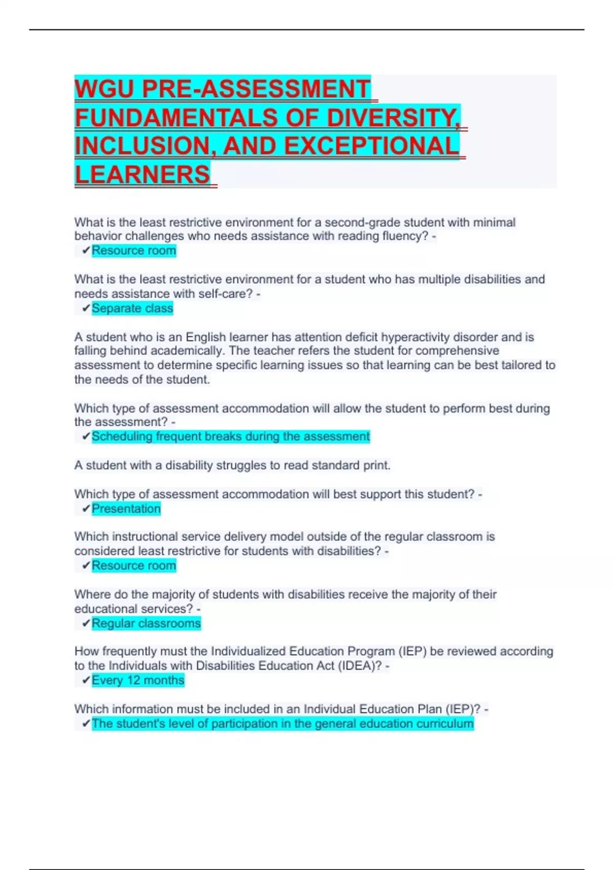 WGU PRE-ASSESSMENT FUNDAMENTALS OF DIVERSITY, INCLUSION, AND EXCEPTIONAL LEARNERS