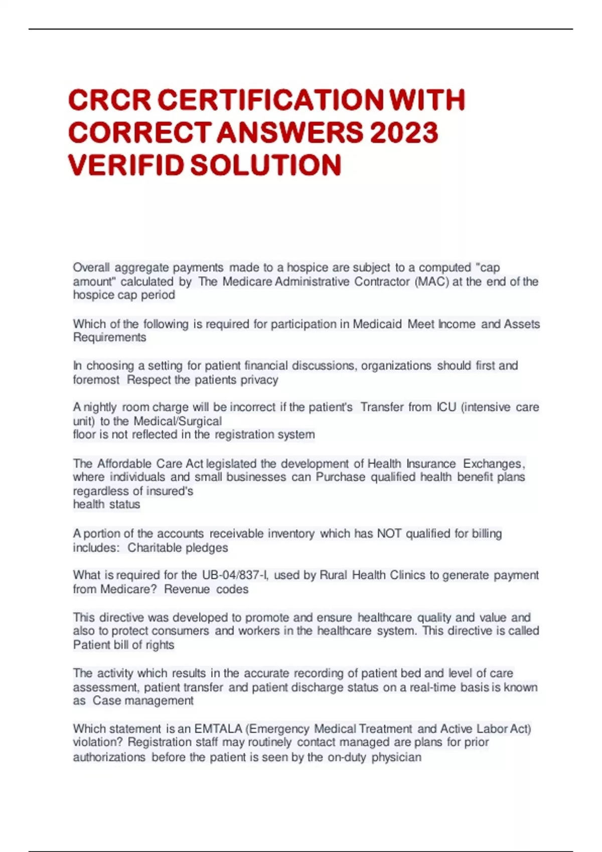 CRCR CERTIFICATION WITH CORRECT ANSWERS 2023 VERIFID SOLUTION