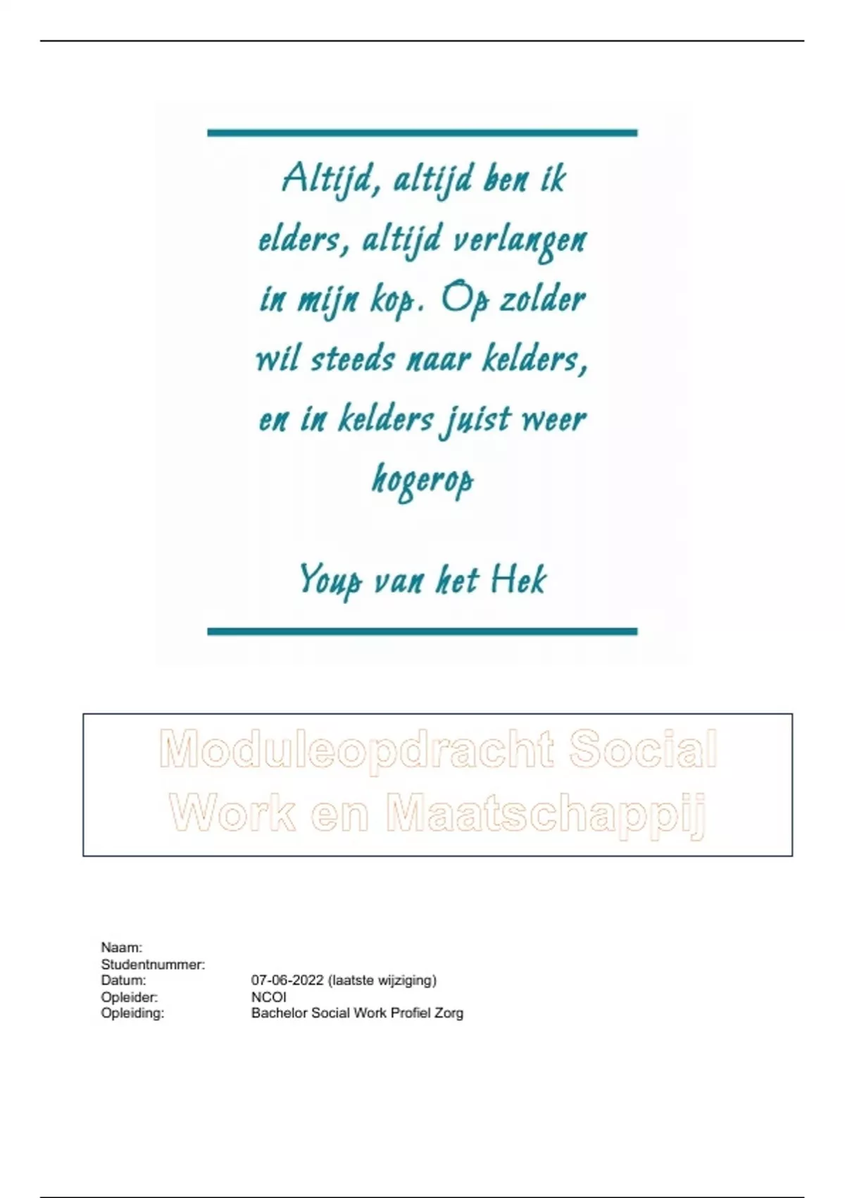 Deze module wordt afgesloten met een betoog. Je bent niet geheel vrij in de inhoudskeuze. Het thema moet te maken hebben met je huidige praktijksituatie en wordt ingekaderd door de thema’s van de module, zoals hieronder wordt geformuleerd. Je schrijft een betoog over een actueel maatschappelijk thema in relatie tot nieuwe ontwikkelingen in het sociaal werk en je visie hierop. Kies een thema in de context van deze module waar je je betrokken bij voelt en dat je in gedachten bezighoudt. Als er een algemene kwestie achter schuilt en het sociale professionals aangaat, is het thema geschikt voor het schrijven van een betoog. Het thema is niet geschikt voor het schrijven van een betoog als je al een duidelijke oplossing voor het vraagstuk voor ogen hebt. Het is juist de bedoeling dat je vanuit verschillende kanten het vraagstuk bekijkt. Je beargumenteert hoe je tot je visie komt. Integreer in je betoog minimaal twee thema’s die aan bod zijn gekomen in de module. Globale voorbeelden van betogen met voorbeelden van thema's die daarbij kunnen passen: Jongerenwerk: meer dan kletsen en gamen met pubers (Thema’s: diversiteit, digitalisering, sociale veranderingen) Vergrijzing: een nieuwe uitdaging voor sociaal werkers (Thema’s: diversiteit, digitalisering, sociale veranderingen) Jong, migrant en crimineel: werk aan de winkel voor sociaal werkers (Thema’s: mens als kuddedier, diversiteit, cultuur en communicatie) Een betoog is een tekst waarin de schrijver zijn lezer probeert te overtuigen van zijn mening. De kerngedachte van een betoog is de mening die de schrijver heeft over een bepaald onderwerp. De schrijver onderbouwt zijn/haar standpunt door middel van argumenten. Deze argumenten kunnen zowel feitelijk (objectief) als waarderend (subjectief) zijn.