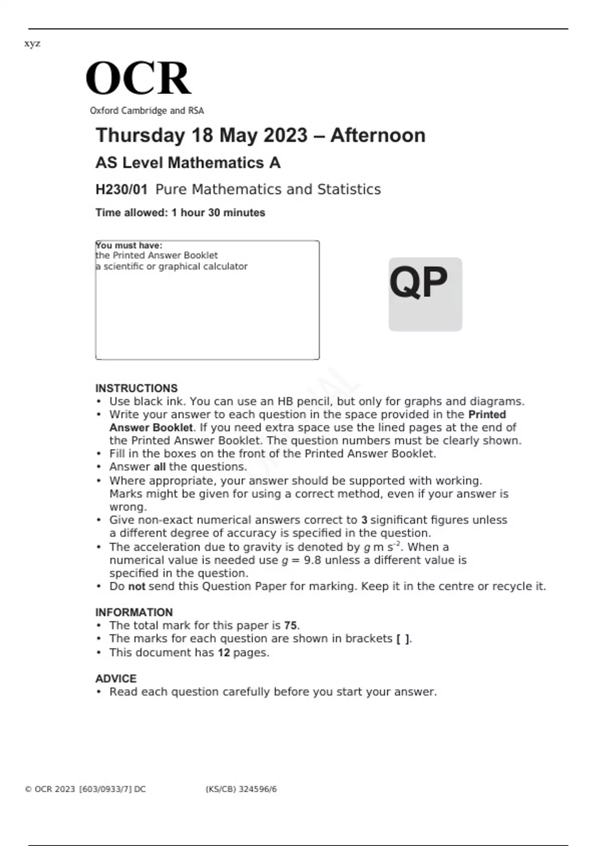 ocr as level mathematics a h23001 qp