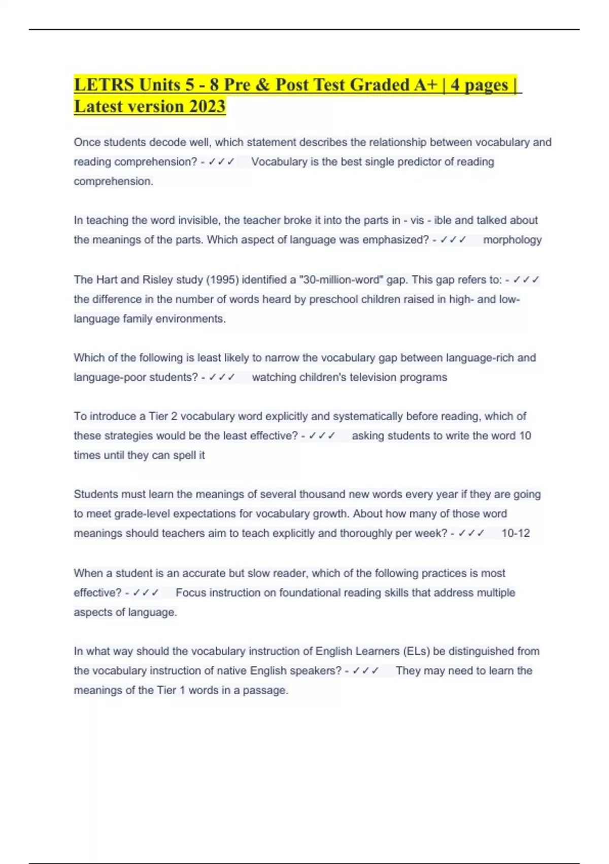 LETRS Units 5 - 8 Pre & Post Test Graded A+ | 4 pages | Latest version 2023