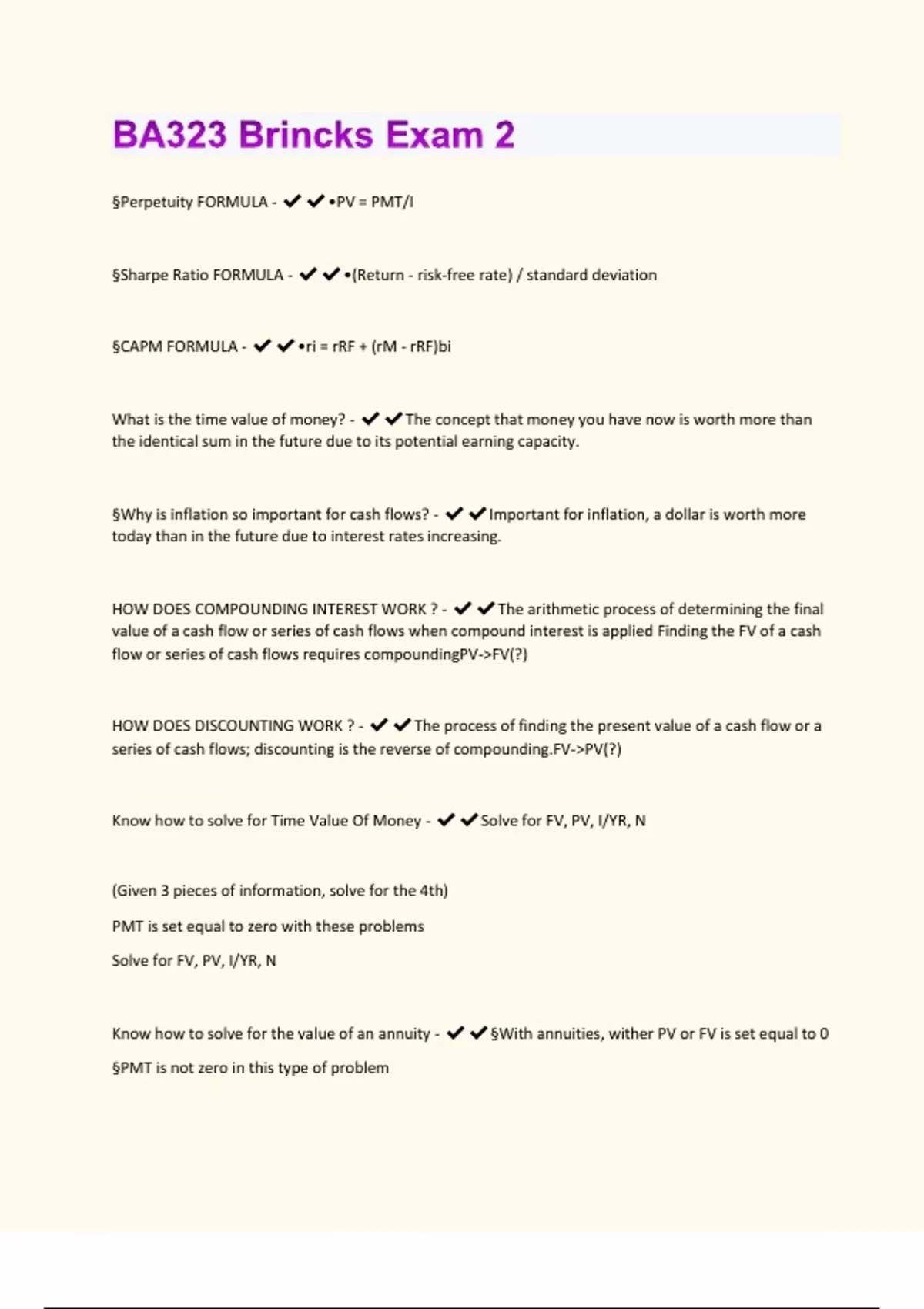§Perpetuity FORMULA - •PV = PMT/I §Sharpe Ratio FORMULA - •(Return - risk-free rate) / standard deviation §CAPM FORMULA - •ri = rRF + (rM - rRF)bi What is the time value of money? - The concept that money you have now is worth more than the identical sum in the future due to its potential earning capacity. §Why is inflation so important for cash flows? - Important for inflation, a dollar is worth more today than in the future due to interest rates increasing. HOW DOES COMPOUNDING INTEREST WORK ? - The arithmetic process of determining the final value of a cash flow or series of cash flows when compound interest is applied Finding the FV of a cash flow or series of cash flows requires compoundingPV->FV(?) HOW DOES DISCOUNTING WORK ? - The process of finding the present value of a cash flow or a series of cash flows; discounting is the reverse of compounding.FV->PV(?) Know how to solve for Time Value Of Money - Solve for FV, PV, I/YR, N (Given 3 pieces of information, solve for the 4th) PMT is set equal to zero with these problems Solve for FV, PV, I/YR, N Know how to solve for the value of an annuity - §With annuities, wither PV or FV is set equal to 0 §PMT is not zero in this type of problemKnow how to solve for Perpetuity - FOREVER CASH FLOW / NO CALCULATOR NEEDED The formula for an annuity that pays a cash flow forever Need to know the formula (can't use calculator) What is a Bond - A long-term debt instrument in which a borrower agrees to make payments of principal and interest, on specific dates, to the holders of the bond.