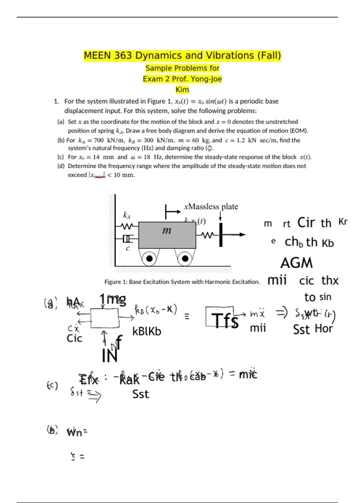 MEEN 363 Dynamics and Vibrations (Fall) Sample Problems for Exam 2 Prof. Yong-Joe Kim 1. For the system illustrated in Figure 1,