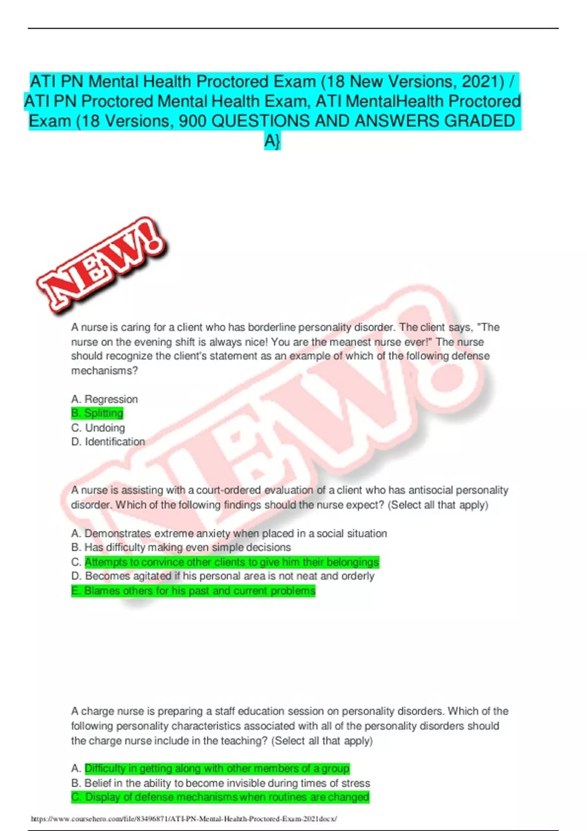 ATI PN Mental Health Proctored Exam (18 New Versions, 2021) / ATI PN Proctored Mental Health Exam, ATI MentalHealth Proctored Exam (18 Versions, 900 QUESTIONS AND ANSWERS GRADED A}