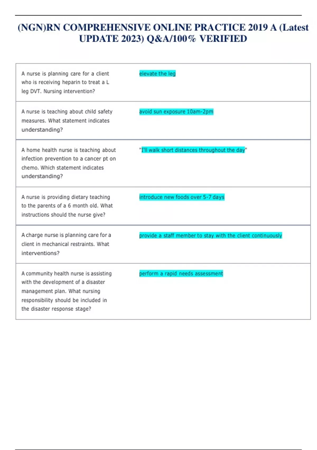 (NGN)RN COMPREHENSIVE ONLINE PRACTICE 2019 A (Latest UPDATE 2023) Q&A/100% VERIFIED A nurse is planning care for a client who is receiving heparin to treat a L leg DVT. Nursing intervention? elevate the leg A nurse is teaching about child safety measures. What statement indicates understanding? avoid sun exposure 10am-2pm A home health nurse is teaching about infection prevention to a cancer pt on chemo. Which statement indicates understanding? "I'll walk short distances throughout the day" A nurse is providing dietary teaching to the parents of a 6 month old. What instructions should the nurse give? introduce new foods over 5-7 days A charge nurse is planning care for a client in mechanical restraints. What interventions? provide a staff member to stay with the client continuously A community health nurse is assisting with the development of a disaster management plan. What nursing responsibility should be included in the disaster response stage? perform a rapid needs assessment A nurse manager is assisting with the orientation of a newly licensed nurse. Which of the following requires manager intervention? tells the hospital chaplain a client's diagnosis A nurse is caring for a client that is in labor at 39 weeks gestation. During the second stage of labor, the nurse observes early decelerations on the monitor. What action should the nurse take? continue observing the fetal heart rate A nurse manager is planning to make changes to the current scheduling system on the unit. To facilitate staff acceptance, what should the nurse manager do first? provide information about scheduling issues to staff A nurse is planning teaching about allowable foods for a client with uric acid-based urinary calculi formation. What foods should the nurse recommend? oranges A charge nurse is teaching a newly licensed nurse how to identify true labor. What should the nurse include in the teaching? the cervix transitions to an anterior position A nurse on a med-surg unit is caring for a client prior to a surgical procedure. Which of the following findings should indicate to the nurse that the client can sign the informed consent? the client an accurately describe the procedure A charge nurse assigns a new nurse to a client with a chest tube. The new nurse expresses concern d/t limited experience with monitoring drainage. What should the charge do to teach about chest tubes? ask the nurse about their knowledge of the procedure A nurse is teaching a client about a new prescription for estradiol. For which of the following adverse effects should the nurse tell the client to monitor and contact the provider? headaches