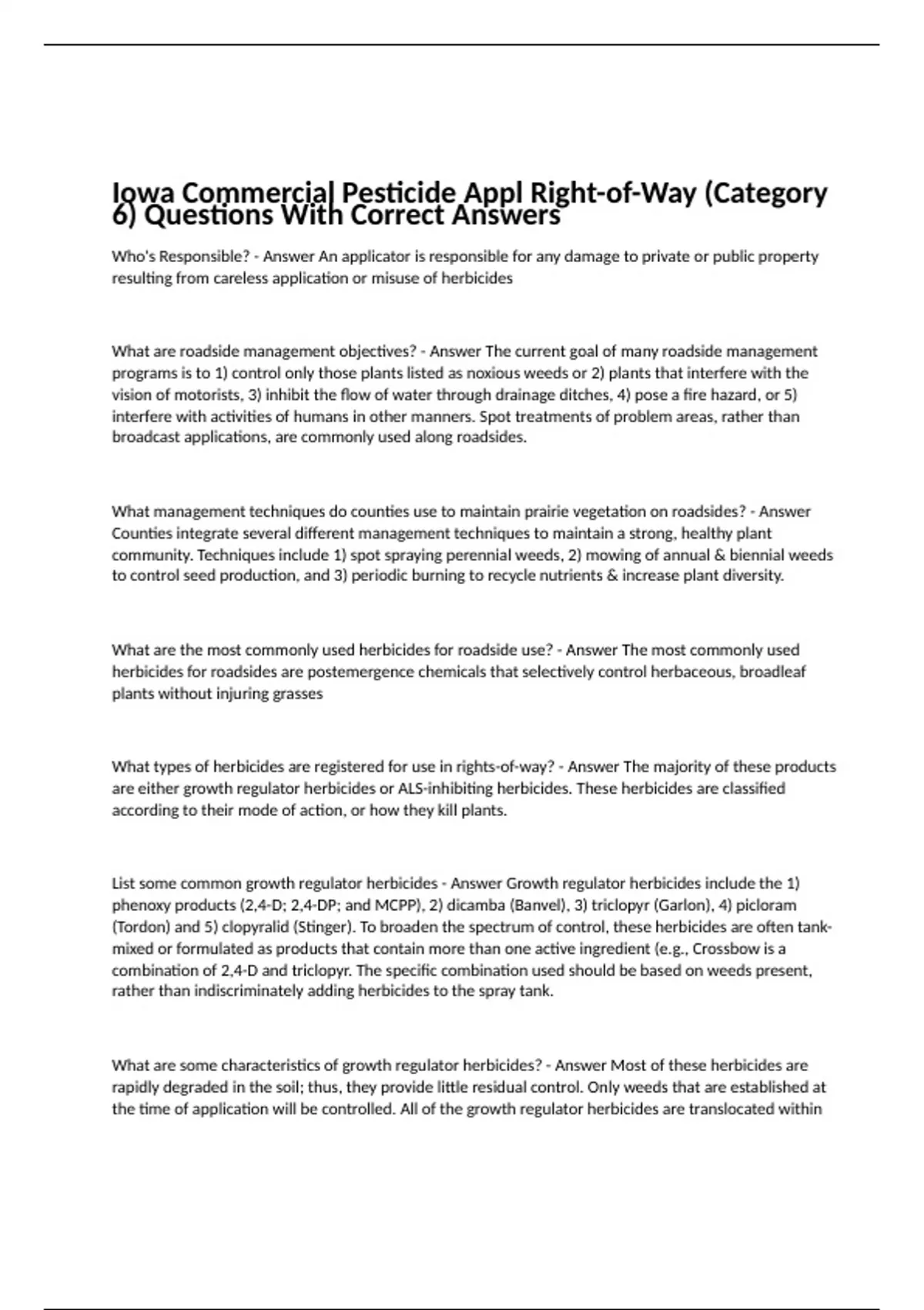 Iowa Commercial Pesticide Appl: Right-of-Way (Category 6) Questions With Correct Answers