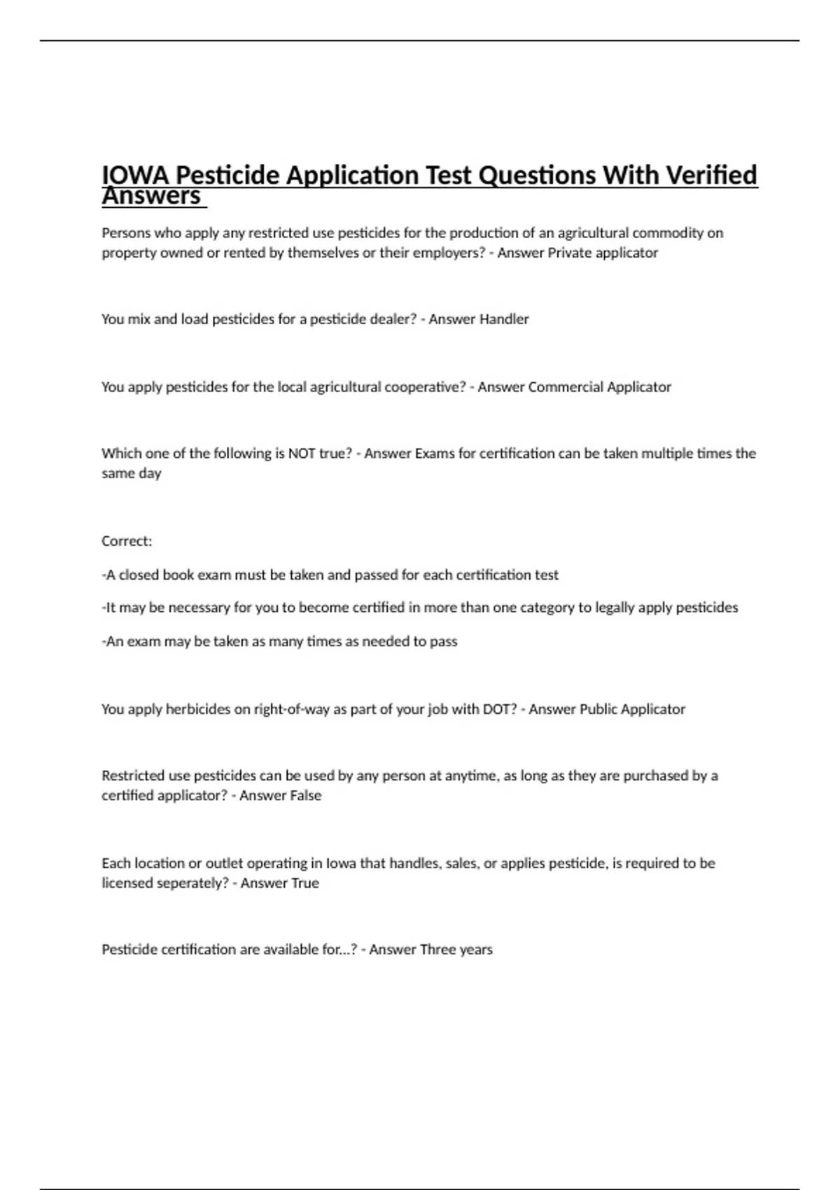 IOWA Pesticide Application Test Questions With Verified Answers