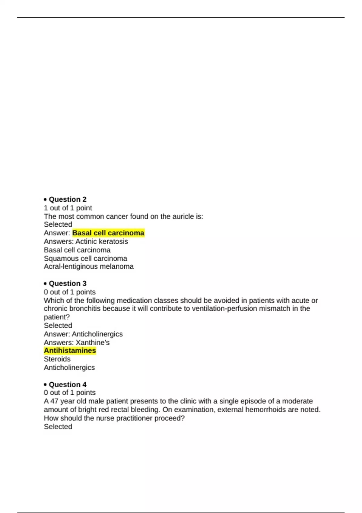 • Question 2 1 out of 1 point The most common cancer found on the auricle is: Actinic keratosis Basal cell carcinoma Squamous cell carcinoma Acral-lentiginous melanoma Answer: Basal cell carcinoma • Question 3 0 out of 1 points Which of the following medication classes should be avoided in patients with acute or chronic bronchitis because it will contribute to ventilation-perfusion mismatch in the patient? Selected Answer: Anticholinergics Answers: Xanthine’s Antihistamines Steroids Anticholinergics • Question 4 0 out of 1 points A 47 year old male patient presents to the clinic with a single episode of a moderate amount of bright red rectal bleeding. On examination, external hemorrhoids are noted. How should the nurse practitioner proceed? Selected Answer: Instruct the patient on measures to prevent hemorrhoids such as bowel habits and diet. Answers: Instruct the patient on measures to prevent hemorrhoids such as bowel habits and diet. Order a topical hemorrhoid cream along with a stool softener. Refer the patient for a barium enema and sigmoidoscopy. Refer the patient for a surgical hemorrhoidectomy. • Question 5 0 out of 1 points Which of the following patient characteristics are associated with chronic bronchitis? Selected Answer: Underweight, pink skin, and increased respiratory rate Answers: Overweight, cyanosis, and normal or slightly increased respiratory rate Underweight, pink skin, and increased respiratory rate Overweight, pink skin, and normal or slightly increased respiratory rate Normal weight, cyanosis, and greatly increased respiratory rate • Question 6 1 out of 1 point A 65-year-old female with a past medical history of hypertension, hyperlipidemia, and Polymyalgia rheumatica presents to urgent care with new-onset left lower quadrant pain. Her current medications include omeprazole 20 milligrams PO daily, lisinopril 20 milligrams PO daily, simvastatin 20 milligrams PO daily, and prednisone 12 milligrams per Daily. The nurse practitioner suspects acute diverticulitis and possibly an abscess. The The most appropriate diagnostic test for this patient at this time is: Selected Answer: CT scan Answers: CBC/dif Erythrocyte sedimentation rate Abdominal ultrasound CT scan
