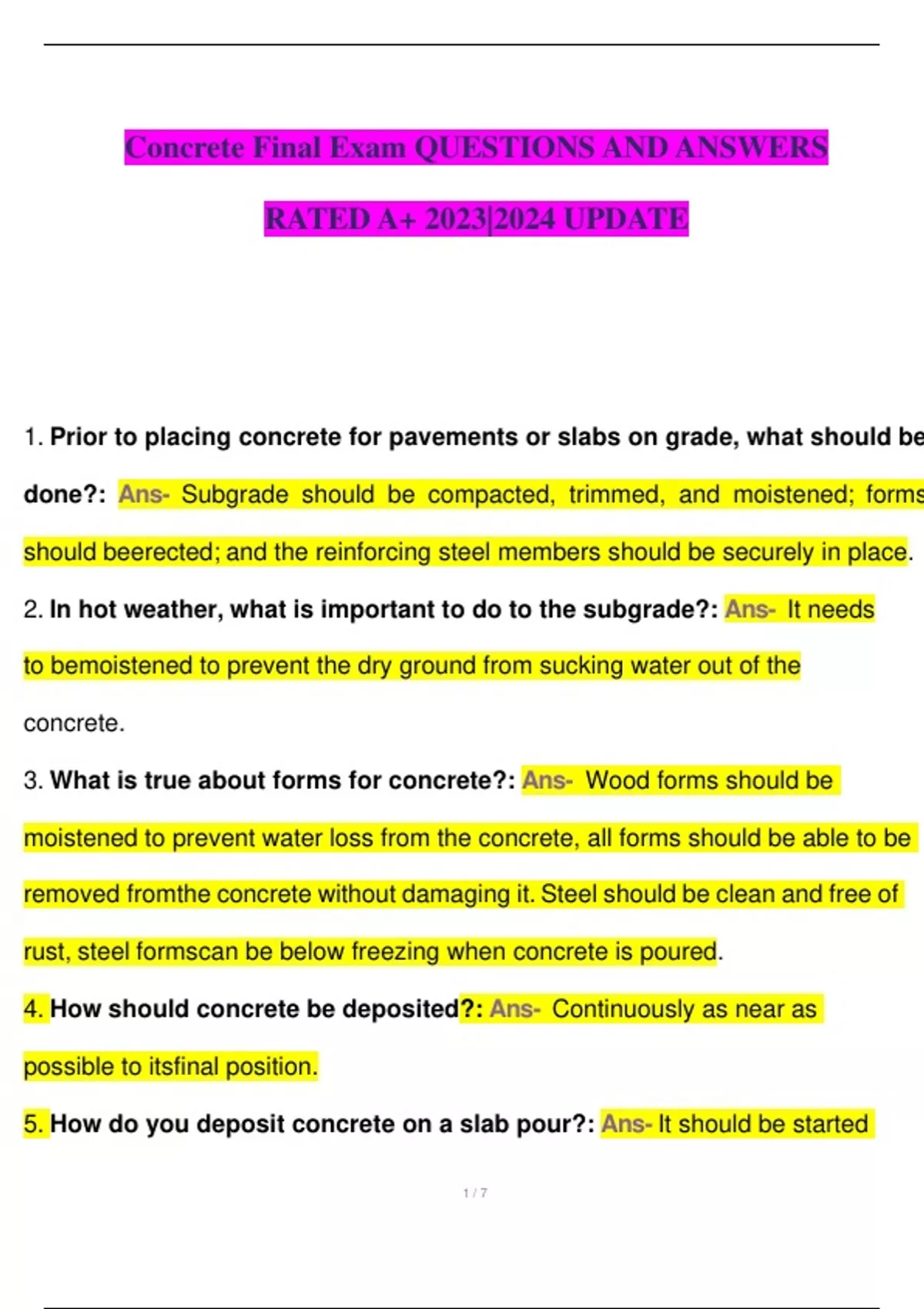 Concrete Final Exam QUESTIONS AND ANSWERS RATED A+ 2023|2024 UPDATE 1. Prior to placing concrete for pavements or slabs on grade, what should be done?: Ans- Subgrade should be compacted, trimmed, and moistened; forms should beerected; and the reinforcing steel members should be securely in place. 2. In hot weather, what is important to do to the subgrade?: Ans- It needs to bemoistened to prevent the dry ground from sucking water out of the concrete. 3. What is true about forms for concrete?: Ans- Wood forms should be moistened to prevent water loss from the concrete, all forms should be able to be removed fromthe concrete without damaging it. Steel should be clean and free of rust, steel formscan be below freezing when concrete is poured. 4. How should concrete be deposited?: Ans- Continuously as near as possible to itsfinal position. 5. How do you deposit concrete on a slab pour?: Ans- It should be started 2 / 7 along theperimeter at one end of the slab, the concrete should not be dumped in separate areas and spread out. 6. How should concrete be placed in walls, thick slabs, or foundations?: Ans- In horizontal layers of uniform thickness, each layer should be consolidated before thenext layer is added. 7. How rapidly should concrete be placed when pouring in layers?: Ans- Fastenough to not let the previous layer set. 8. How is concrete moved to lower elevations?: Ans- Chutes and drop chutes are usedto prevent segregation of the concrete. 9. How far can you drop concrete without segregation?: 50 feet 10. What is placed at the end of a chute to control the flow of concrete onto sloped surfaces?: A baffle 11. How thick should the layers of freshly mixed concrete be?: 6 inches to 20 inches thick for reinforced members, and 15 inches to 20 inches thick for mass work. 12. What determines the thickness of a layer of concrete?: Width between forms and the amount of reinforcement. 13. Should concrete be moved horizontally?: No, this causes segregation. If it has to be done it should be kept to a minimum. 14. What should be done if pouring concrete in an area where standing water