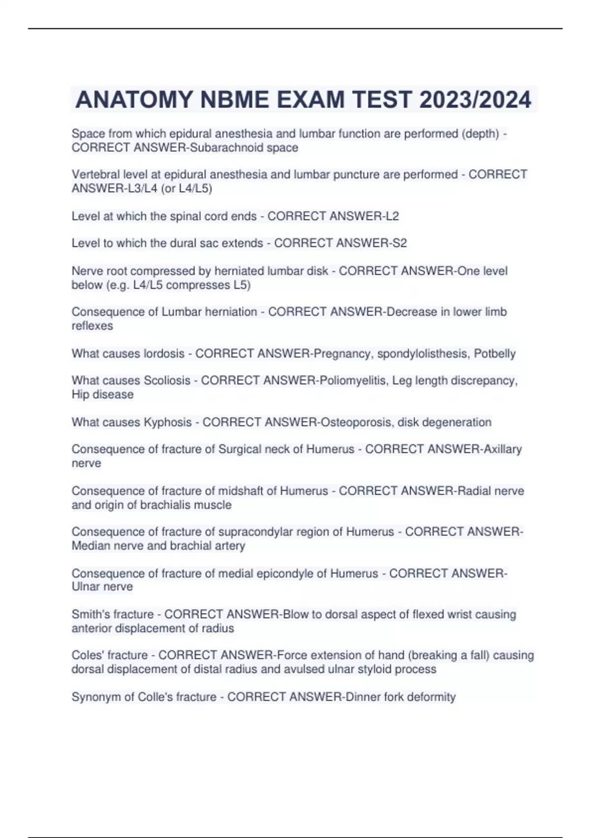 ANATOMY NBME EXAM TEST 2023/2024 Space from which epidural anesthesia and lumbar function are performed (depth) - CORRECT ANSWER-Subarachnoid space Vertebral level at epidural anesthesia and lumbar puncture are performed - CORRECT ANSWER-L3/L4 (or L4/L5) Level at which the spinal cord ends - CORRECT ANSWER-L2 Level to which the dural sac extends - CORRECT ANSWER-S2 Nerve root compressed by herniated lumbar disk - CORRECT ANSWER-One level below (e.g. L4/L5 compresses L5) Consequence of Lumbar herniation - CORRECT ANSWER-Decrease in lower limb reflexes What causes lordosis - CORRECT ANSWER-Pregnancy, spondylolisthesis, Potbelly What causes Scoliosis - CORRECT ANSWER-Poliomyelitis, Leg length discrepancy, Hip disease What causes Kyphosis - CORRECT ANSWER-Osteoporosis, disk degeneration Consequence of fracture of Surgical neck of Humerus - CORRECT ANSWER-Axillary nerve Consequence of fracture of midshaft of Humerus - CORRECT ANSWER-Radial nerve and origin of brachialis muscle Consequence of fracture of supracondylar region of Humerus - CORRECT ANSWERMedian nerve and brachial artery Consequence of fracture of medial epicondyle of Humerus - CORRECT ANSWERUlnar nerve Smith's fracture - CORRECT ANSWER-Blow to dorsal aspect of flexed wrist causing anterior displacement of radius Coles' fracture - CORRECT ANSWER-Force extension of hand (breaking a fall) causing dorsal displacement of distal radius and avulsed ulnar styloid process Synonym of Colle's fracture - CORRECT ANSWER-Dinner fork deformity Cause of scaphoid fracture - CORRECT ANSWER-Fall onto palm when hand is abducted Signs of scaphoid fracture - CORRECT ANSWER-Pain on lateral side of wrist during extension and abduction, deep tenderness of anatomical snuffbox Boxer's fracture - CORRECT ANSWER-Fracture of neck of metacarpal's : 2nd and 3rd for professionals, 4th and 5th for unskilled Cause of Mallet finger - CORRECT ANSWER-Hyperflexion of DIP joint Result of mallet finger - CORRECT ANSWER-Inability to extend DIP joint due to avulsion of extensor digitorum tendon to the base of the distal phalanx Region of shoulder joint where dislocation is most probable and reason - CORRECT ANSWER-Inferiorly due to the absence of rotator cuff tendon Synonym of Mallet Finger - CORRECT ANSWER-Baseball finger Muscle that abducts upper limb from 0-15 degrees and nerve - CORRECT ANSWERSupraspinatus, Suprascapular nerve Muscle that abducts upper limb from 15 - 110 degrees and nerve - CORRECT ANSWER-Deltoid, Axillary nerve Muscle that abducts upper limb from 110 - 180 degrees and nerve - CORRECT ANSWER-Trapezius, Spinal accessory nerve & Serratus anterior, Long thoracic nerve Cause of sub acromial bursitis - CORRECT ANSWER-Calcified supraspinatus tendinitis Symptoms of Sub acromial bursitis - CORRECT ANSWER-Painful arc of abduction Cause of Student's elbow - CORRECT ANSWER-Repeated excessive pressure to the olecranon bursa Synonym of Student's elbow - CORRECT ANSWER-Subcutaneous Olecranon Bursitis Synonym of Tennis elbow - CORRECT ANSWER-Lateral Epicondylitis Cause of tennis elbow - CORRECT ANSWER-Strain on the common extensor tendon and inflammation of the periosteum of the lateral epicondyle Muscles affected by Tennis elbow - CORRECT ANSWER-Extensor carpi radialis longus and brevis, Extensor digitorum, Extensor digiti mini, Extensor carpi ulnaris Synonym of Golfer's elbow - CORRECT ANSWER-Medial epicondylitis Cause of Golfer's elbow - CORRECT ANSWER-Inflammation of the common flexor tendon Muscles affected by Golfer's elbow - CORRECT ANSWER-Pronator teres, Flexor carpi radialis, Palmaris longus, Flexor carpi ulnaris Main arteries that provide anastomoses when subclavian or axillary are blocked (2) - CORRECT ANSWER-Thyrocervical trunk, Subscapular arteries Small arteries (branches) that provide anastomoses when subclavian or axillary are blocked (4) - CORRECT ANSWER-Subscapular, Suprascapular, Circumflex scapular, Transverse cervical Contents of cubital fossa from lateral to medial - CORRECT ANSWER-Biceps tendon, Brachial artery, Median nerve Subcutaneous structures of the cubital fossa from lateral to medial - CORRECT ANSWER-Cephalic vein, Median cubital vein, Basilic vein Site of venipuncture and reason - CORRECT ANSWER-Median cubital vein because content of cubital fossa protected by bicipital aponeurosis Cause of carpal tunnel syndrome - CORRECT ANSWER-Reduction of carpal tunnel size due to dislocation of lunate bone, fluid retention, infection Clinical manifestations of carpal tunnel syndrome - CORRECT ANSWER-Anesthesia of lateral 3.5 digits, Palm sensation not affected (Superficial palmar cutaneous), Absence of opposition Synonym of upper brachial palsy - CORRECT ANSWER-Erb-Duchenne Cause of Erb-Duchenne palsy - CORRECT ANSWER-Increase in the angle of the neck and shoulder or birth injury due to forceful pulling of infant's head which leads to injury of the upper roots and trunks (C5 and C6) Nerve's injured in Erb-Duchenne palsy - CORRECT ANSWER-Axillary, Suprascapular, Musculocutaneous Signs of Erb-Duchenne palsy - CORRECT ANSWER-Waiter's tip: loss of sensation in the lateral aspect of the UL, adducted shoulder, Medial rotation of arm, Extension of elbow Synonym of lower brachial palsy - CORRECT ANSWER-Klumpke paralysis Cause of Klumpke paralysis - CORRECT ANSWER-Injury to the lower roots and trunk (C8-T1) due to UL being pulled superiorly (grabbing support while falling, birth injury) Pathology associated with Klumpke paralysis - CORRECT ANSWER-Thoracic outlet/Horner syndrome Lesion to what nerve causes Claw hand - CORRECT ANSWER-Ulnar nerve Lesion to what nerve causes Ape hand - CORRECT ANSWER-Median nerve Signs of Klumpke paralysis - CORRECT ANSWER-Combination of Claw hand and Ape hand, Loss of sensation on medial side of UL and medial 1.5 fingers Cause of injury to musculocutaneous nerve - CORRECT ANSWER-Lesions of the lateral cord Signs of injury to the musculocutaneous nerve - CORRECT ANSWER-Weakened flexion and supination, anesthesia over the late