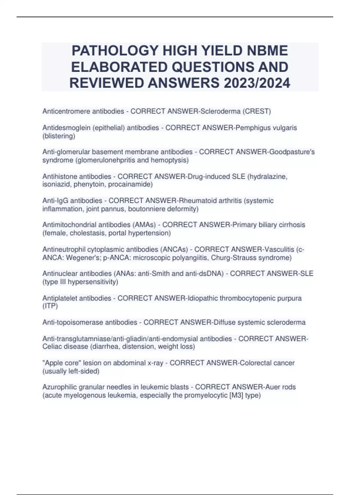 PATHOLOGY HIGH YIELD NBME ELABORATED QUESTIONS AND REVIEWED ANSWERS 2023/2024 Anticentromere antibodies - CORRECT ANSWER-Scleroderma (CREST) Antidesmoglein (epithelial) antibodies - CORRECT ANSWER-Pemphigus vulgaris (blistering) Anti-glomerular basement membrane antibodies - CORRECT ANSWER-Goodpasture's syndrome (glomerulonehpritis and hemoptysis) Antihistone antibodies - CORRECT ANSWER-Drug-induced SLE (hydralazine, isoniazid, phenytoin, procainamide) Anti-IgG antibodies - CORRECT ANSWER-Rheumatoid arthritis (systemic inflammation, joint pannus, boutonniere deformity) Antimitochondrial antibodies (AMAs) - CORRECT ANSWER-Primary biliary cirrhosis (female, cholestasis, portal hypertension) Antineutrophil cytoplasmic antibodies (ANCAs) - CORRECT ANSWER-Vasculitis (cANCA: Wegener's; p-ANCA: microscopic polyangiitis, Churg-Strauss syndrome) Antinuclear antibodies (ANAs: anti-Smith and anti-dsDNA) - CORRECT ANSWER-SLE (type III hypersensitivity) Antiplatelet antibodies - CORRECT ANSWER-Idiopathic thrombocytopenic purpura (ITP) Anti-topoisomerase antibodies - CORRECT ANSWER-Diffuse systemic scleroderma Anti-transglutamniase/anti-gliadin/anti-endomysial antibodies - CORRECT ANSWERCeliac disease (diarrhea, distension, weight loss) "Apple core" lesion on abdominal x-ray - CORRECT ANSWER-Colorectal cancer (usually left-sided) Azurophilic granular needles in leukemic blasts - CORRECT ANSWER-Auer rods (acute myelogenous leukemia, especially the promyelocytic [M3] type) Bacitracin response - CORRECT ANSWER-Sensitive: Streptocococcus pyogenes (group A) Resistant: Streptococcus agalactiae (group B) "Bamboo spine" on x-ray - CORRECT ANSWER-Ankylosing spondylitis (chronic inflammatory arthritis: HLA-B27) Basophilic nuclear remnants in RBCs - CORRECT ANSWER-Howell-Jolly bodies (due to splenectomy or nonfunctional spleen) Basophilic stippling of RBCs - CORRECT ANSWER-Lead poisoning or sideroblastic anemia Bloddy tap on LP - CORRECT ANSWER-Subarachnoid hemorrhage "Boot-shaped" heart on x-ray - CORRECT ANSWER-Tetralogy of Fallot, RVH Branching gram-positive rods with sulfur granules - CORRECT ANSWER-Actinomyces israelii Bronchogenic apical lung tumor - CORRECT ANSWER-Pancoast tumor (can compress sympathetic ganglion and cause Horner's syndrome) "Brown" tumor of bone - CORRECT ANSWER-Hemorrhage (hemosiderin) causes brown color of osteolytic cysts. Due to: 1. Hyperparathyroidism 2. Osteitis fibrosa cystica Cardiomegaly with apical atrophy - CORRECT ANSWER-Chagas' disease (Trypanosoma cruzi) Cellular crescents in Bowman's capsule - CORRECT ANSWER-Rapidly progressive crescentic glomerulonephritis "Chocolate cyst" of ovary - CORRECT ANSWER-Endometriosis (frequently involves both ovaries) Circular grouping of dark tumor cells surrounding pale neurofibrils - CORRECT ANSWER-Homer Wright rosettes (neuroblastoma, medulloblastoma, retinoblastoma) Colonies of mucoid Pseudomonas in lungs - CORRECT ANSWER-Cystic fibrosis (AR mutation to CFTR resulting in fat-soluble vitamin deficiency and mucous plugs) Decreased alpha-fetoprotein in amniotic fluid/maternal serum - CORRECT ANSWERDown syndrome or other chromosomal abnormality Degeneration of dorsal column nerves - CORRECT ANSWER-Tabes dorsalis (tertiary syphilis) Depigmentation of neurons in substantia nigra - CORRECT ANSWER-Parkinson's disease (basal ganglia disorder: rigidity, resting, tremor, bradykinesia) Desquamated epithelium casts in sputum - CORRECT ANSWER-Curschmann's spirals (bronchial asthma; can result in whorled mucous plugs) Disarrayed granulosa cells in eosinophilic fluid - CORRECT ANSWER-Call-Exner bodies (granulosa-theca cell tumor of the ovary) Dysplastic squamous cervical cells with nuclear enlargment and hyperchromasia - CORRECT ANSWER-Koilocytes (HPV: predisposes to cervical cancer) Enlarged cells with intranuclear inclusion bodies - CORRECT ANSWER-"Owl's eye" appearance of CMV Enlarged thyroid cells with ground-glass nuclei - CORRECT ANSWER-"Orphan Annie" eye nuclei (papillary carcinoma of the thyroid) Eosinophilic cytoplasmic inclusion in liver cell - CORRECT ANSWER-Mallory bodies (alcoholic liver disease) Eosinophilic cytoplasmic inclusion in nerve cell - CORRECT ANSWER-Lewy body (Parkinson's disease) Eosinophilic inclusion bodies in cytoplasm of hippocampal nerve cells - CORRECT ANSWER-Rabies virus (Lyssavirus) Extracellular amyloid deposition in gray matter of brain - CORRECT ANSWER-Senile plaques (Alzhemier's disease) Giant B cells with bilobed nuclei with prominent inclusions ("owl's eye") - CORRECT ANSWER-Reed-Sternberg cells (Hodgkin's lymphoma) Glomerulus-like structure surrounding vessel in germ cells - CORRECT ANSWERSchiller-Duval bodies (yolk sac tumor) "Hair-on-end" (crew cut) appearance on x-ray - CORRECT ANSWER-Beta-thalassemia, sickle cell anemia (marrow expansion) hCG elevated - CORRECT ANSWER-Choriocarcinoma, hydatidiform mole (occurs with and without embryo) Heart nodules (granulomatous) - CORRECT ANSWER-Aschoff bodies (rheumatic fever) Heterophile antibodies - CORRECT ANSWER-Infectious mononucleosis (EBV) Hexagonal, double-pointed, needle-like crystals in bronchial secretions - CORRECT ANSWER-Bronchial asthma (Charcot-Leyden crystals: eosinophilic granules) High level of D-dimers - CORRECT ANSWER-DVT, pulmonary embolism, DIC Hilar lymphadenopathy, peripheral granulomatous lesion in middle or lower lung lobes (can calcify) - CORRECT ANSWER-Ghon complex (primary TB: Mycobacterium bacilli) "Honeycomb lung" on x-ray - CORRECT ANSWER-Interstitial fibrosis Hypersegmented neutrophils - CORRECT ANSWER-Megaloblastic anemia (B12 deficiency: neurologic symptoms; folate deficiency: no neurologic symptoms) Hypochromic microcytic anemia - CORRECT ANSWER-Iron deficiency anemia, lead poisoning, thalassemia (HbF sometimes present) Increased alpha-fetoprotein in amniotic fluid/maternal serum - CORRECT ANSWERDating error, anencephaly, spina bifida (neural tube defects) Increased uric acid levels - CORRECT ANSWER-Gout, Lesch-Nyhan syndrome, tumor lysis