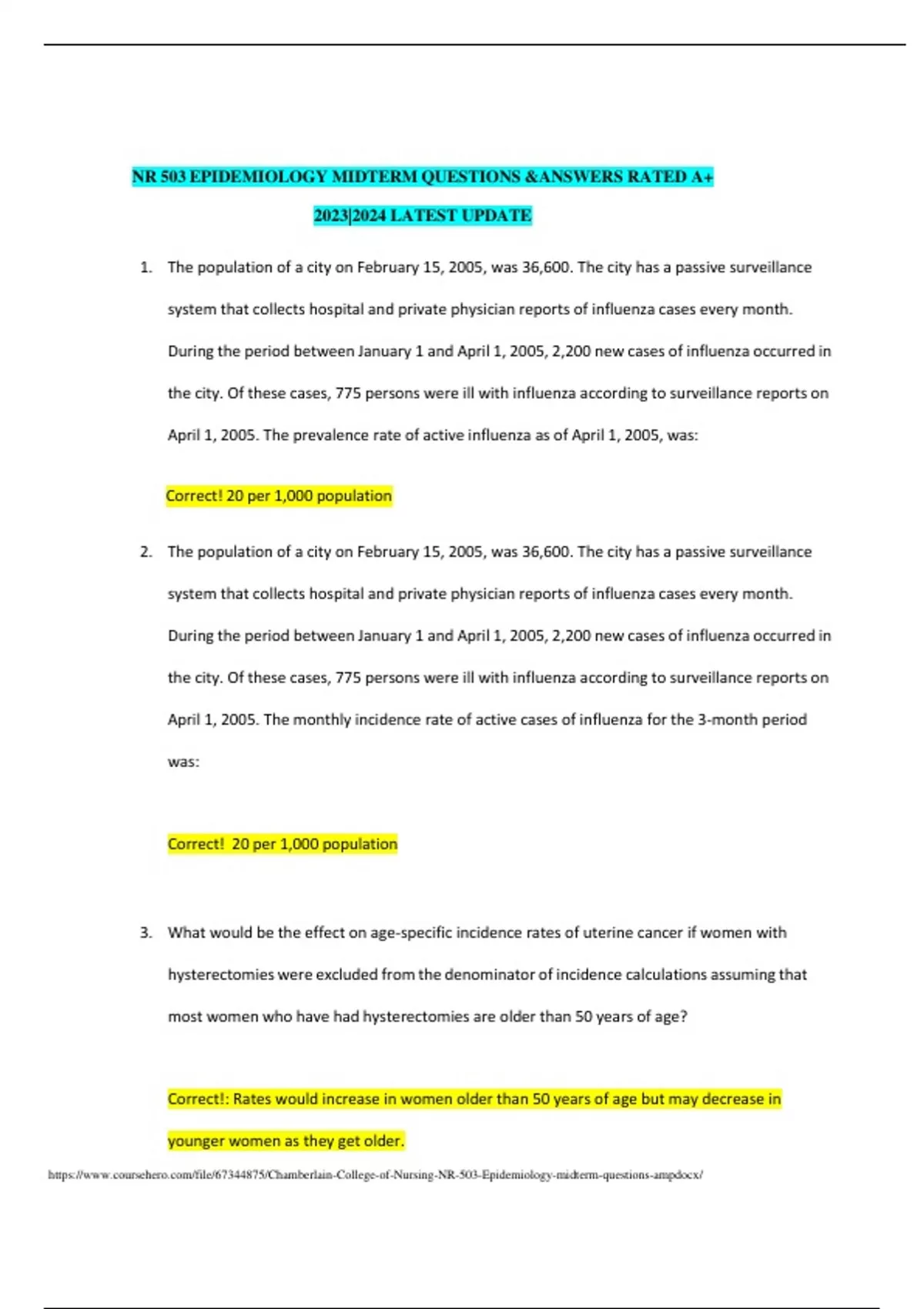 NR 503 EPIDEMIOLOGY MIDTERM QUESTIONS &ANSWERS RATED A+ 2023|2024 LATEST UPDATE 1. The population of a city on February 15, 2005, was 36,600. The city has a passive surveillance system that collects hospital and private physician reports of influenza cases every month. During the period between January 1 and April 1, 2005, 2,200 new cases of influenza occurred in the city. Of these cases, 775 persons were ill with influenza according to surveillance reports on April 1, 2005. The prevalence rate of active influenza as of April 1, 2005, was: Correct! 20 per 1,000 population 2. The population of a city on February 15, 2005, was 36,600. The city has a passive surveillance system that collects hospital and private physician reports of influenza cases every month. During the period between January 1 and April 1, 2005, 2,200 new cases of influenza occurred in the city. Of these cases, 775 persons were ill with influenza according to surveillance reports on April 1, 2005. The monthly incidence rate of active cases of influenza for the 3-month period was: Correct! 20 per 1,000 population 3. What would be the effect on age-specific incidence rates of uterine cancer if women with hysterectomies were excluded from the denominator of incidence calculations assuming that most women who have had hysterectomies are older than 50 years of age? Correct!: Rates would increase in women older than 50 years of age but may decrease in younger women as they get older. 4. The ability of a single person to remain free of clinical illness following exposure to an infectious agent is known as: Correct!: Immunity 5. Which of the following reasons can explain why a person who did not consume the infective food item got sick? Correct: All of the above 6. Which of the food items (or combination of items) is most likely to be the infective item(s)? Correct!: Ice cream only 7. The case-fatality rate associated with plague is lowest in which community? Correct Answer: Community C