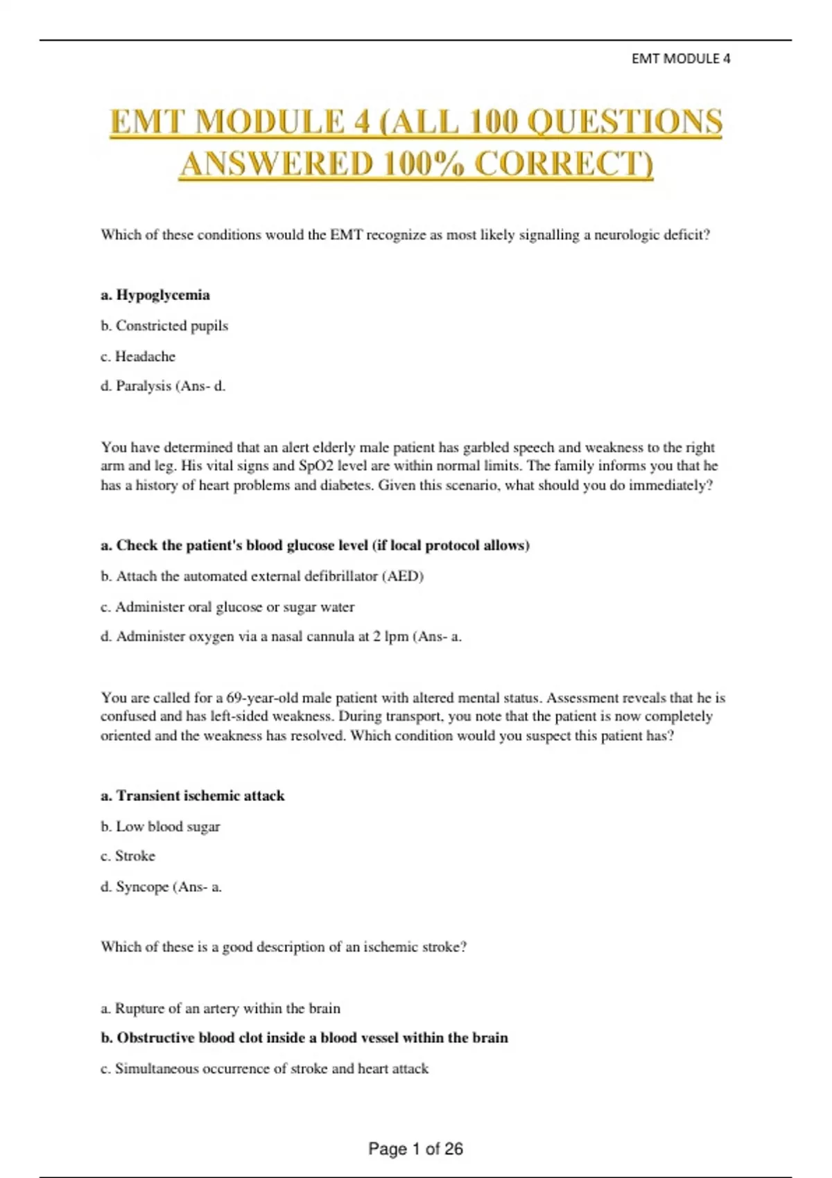 EMT MODULE 4 (ALL 100 QUESTIONS ANSWERED 100% CORRECT),EMT MODULE 4 (ALL 100 QUESTIONS ANSWERED 100% CORRECT),EMT MODULE 4 (ALL 100 QUESTIONS ANSWERED 100% CORRECT),EMT MODULE 4 (ALL 100 QUESTIONS ANSWERED 100% CORRECT)