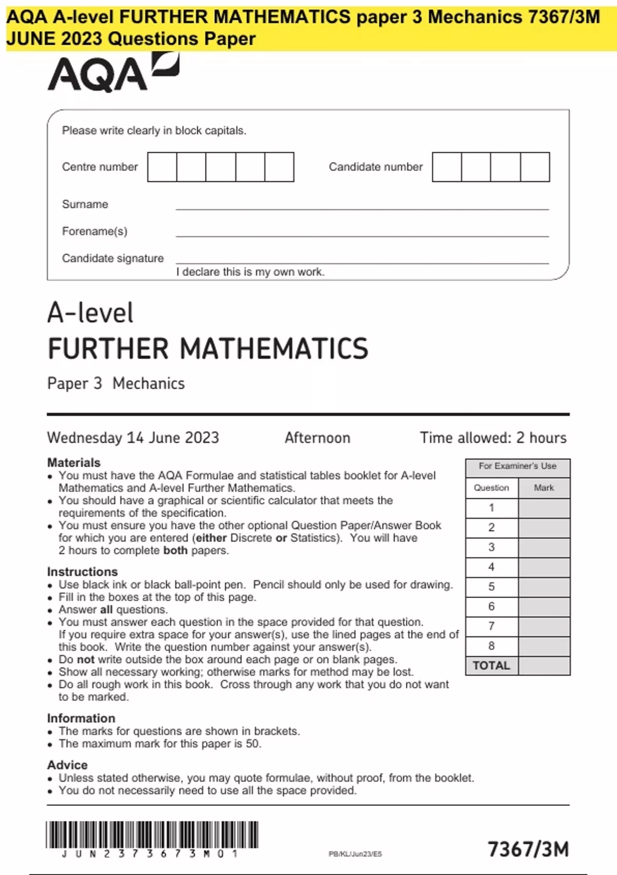 AQA A-level FURTHER MATHEMATICS paper 3 Mechanics 7367/3M JUNE 2023 Questions Paper