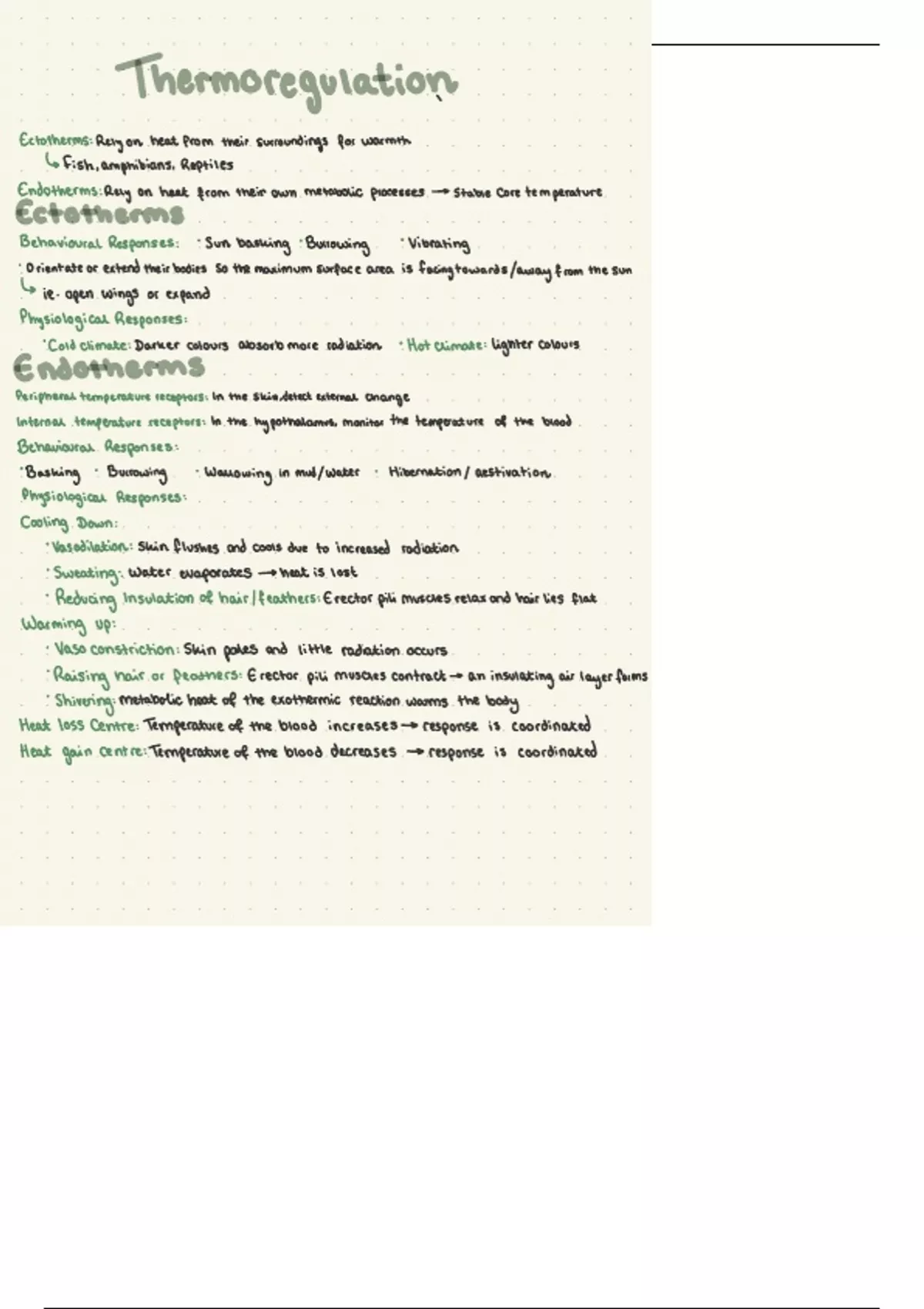Handwritten notes detailing all of the necessary Thermoregulation content for an A* in OCR A-Level Biology.