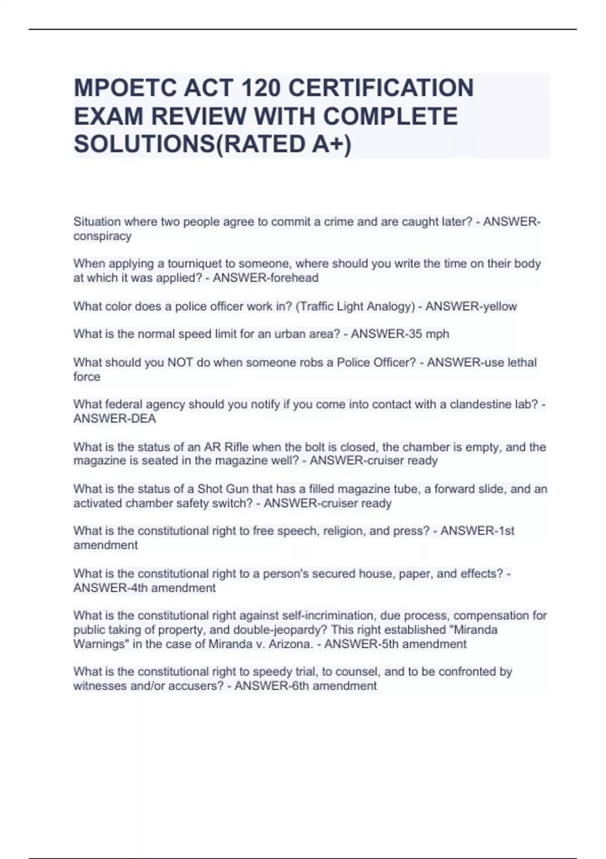 MPOETC ACT 120 CERTIFICATION EXAM REVIEW WITH COMPLETE SOLUTIONS(RATED A+)