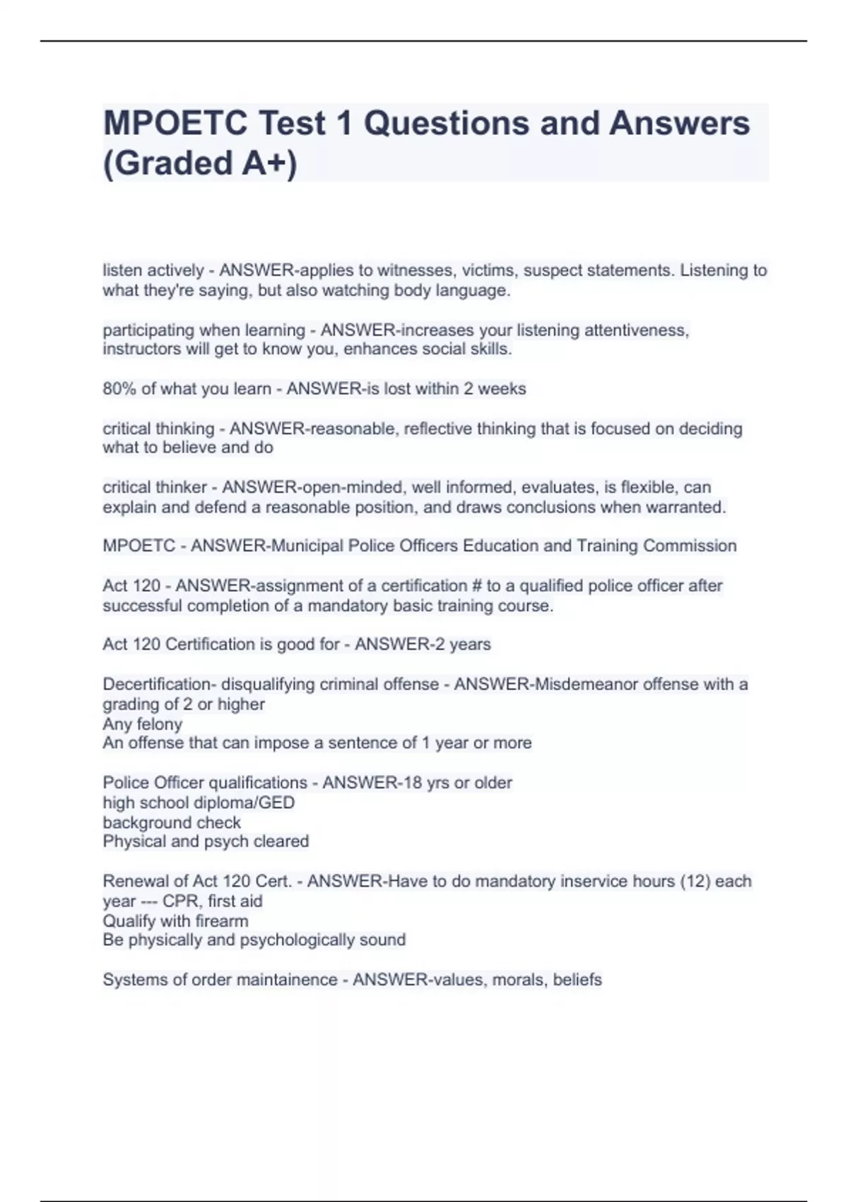 listen actively - ANSWER-applies to witnesses, victims, suspect statements. Listening to what they're saying, but also watching body language. participating when learning - ANSWER-increases your listening attentiveness, instructors will get to know you, enhances social skills. 80% of what you learn - ANSWER-is lost within 2 weeks critical thinking - ANSWER-reasonable, reflective thinking that is focused on deciding what to believe and do critical thinker - ANSWER-open-minded, well informed, evaluates, is flexible, can explain and defend a reasonable position, and draws conclusions when warranted. MPOETC - ANSWER-Municipal Police Officers Education and Training Commission Act 120 - ANSWER-assignment of a certification # to a qualified police officer after successful completion of a mandatory basic training course. Act 120 Certification is good for - ANSWER-2 years Decertification- disqualifying criminal offense - ANSWER-Misdemeanor offense with a grading of 2 or higher Any felony An offense that can impose a sentence of 1 year or more Police Officer qualifications - ANSWER-18 yrs or older high school diploma/GED background check Physical and psych cleared Renewal of Act 120 Cert. - ANSWER-Have to do mandatory inservice hours (12) each year --- CPR, first aid Qualify with firearm Be physically and psychologically sound Systems of order maintainence - ANSWER-values, morals, beliefs