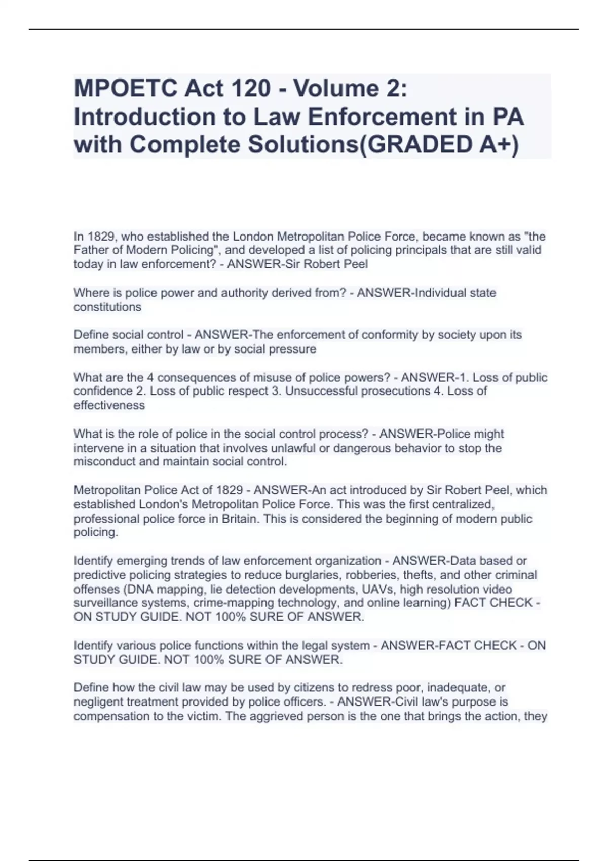 MPOETC Act 120 - Volume 2: Introduction to Law Enforcement in PA with Complete Solutions(GRADED A+)