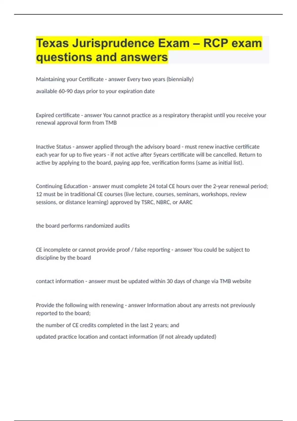 Texas Jurisprudence Exam – RCP exam questions and answers