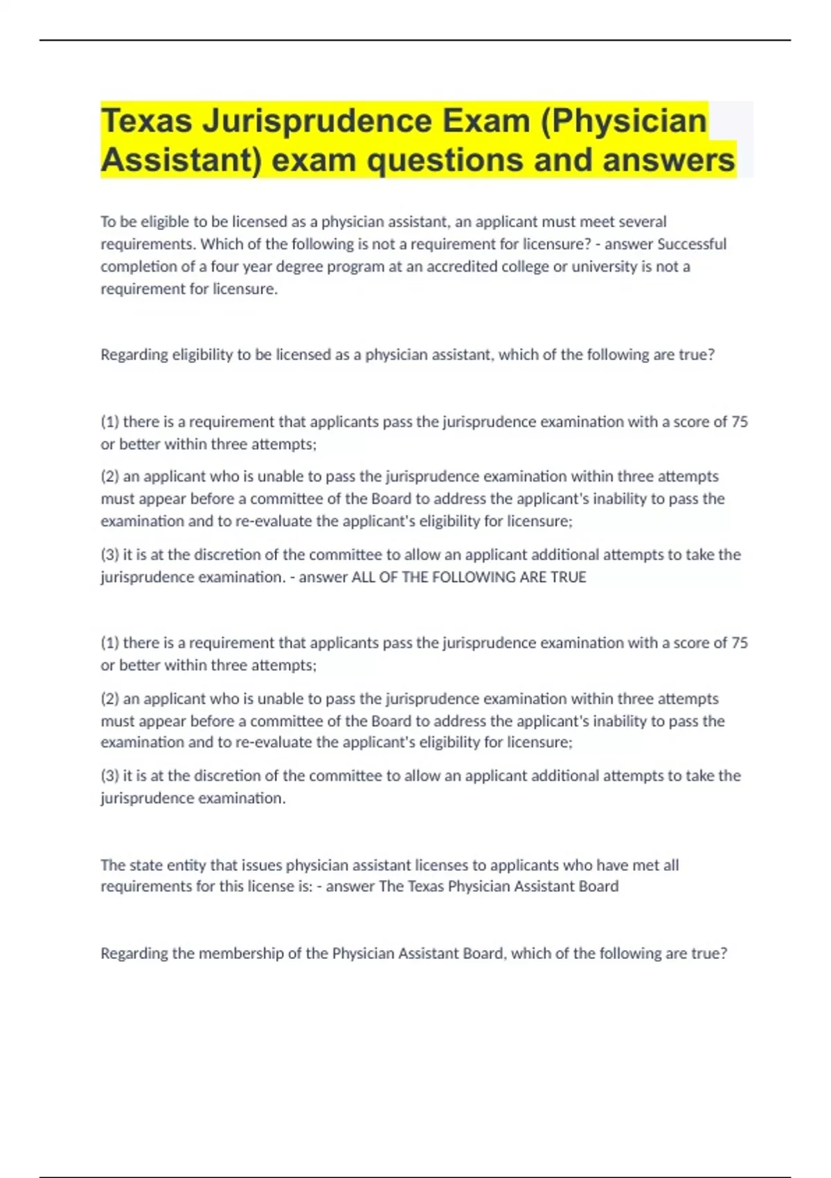 Texas Jurisprudence Exam (Physician Assistant) exam questions and answers