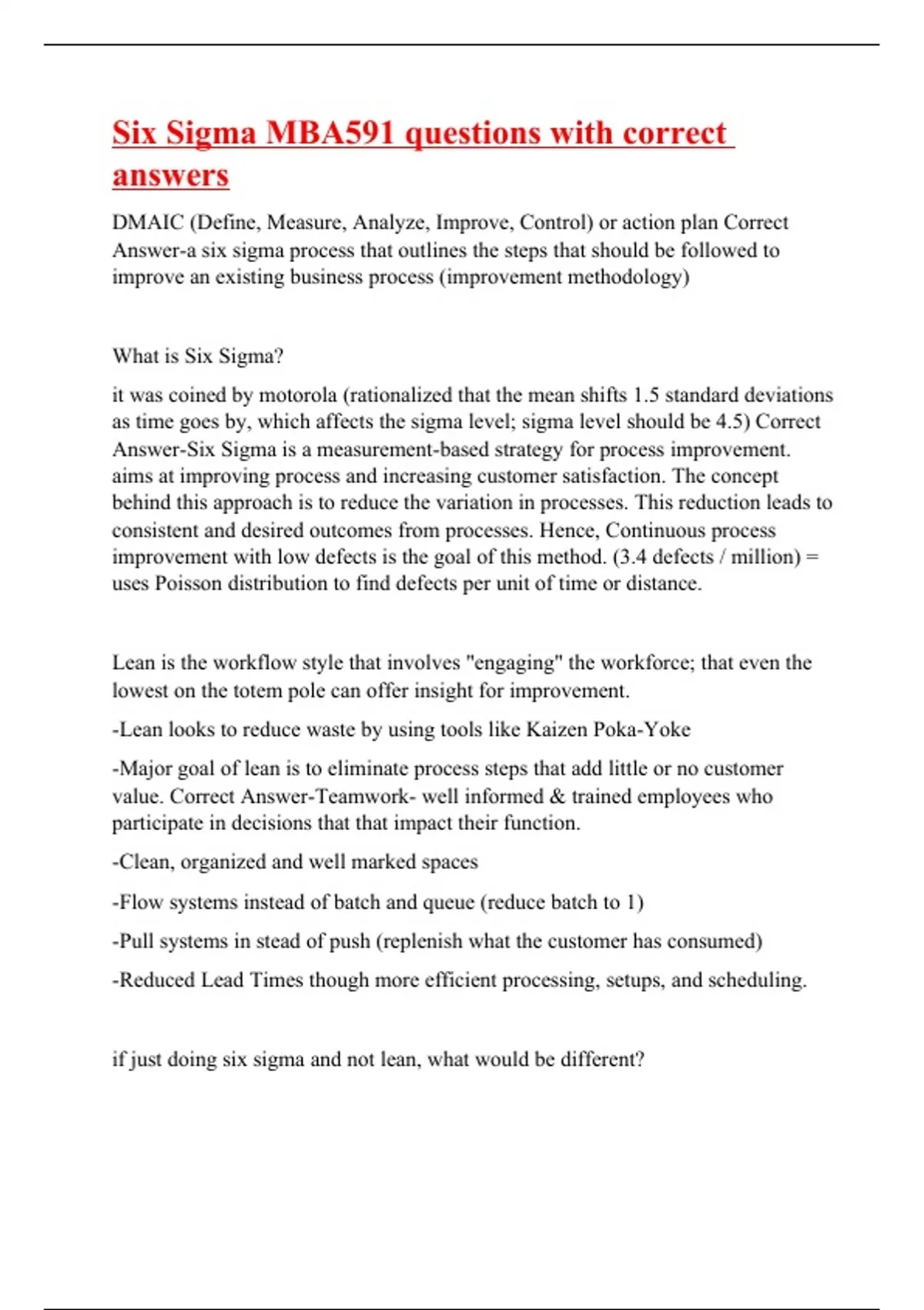 six sigma mba591 questions with correct answers