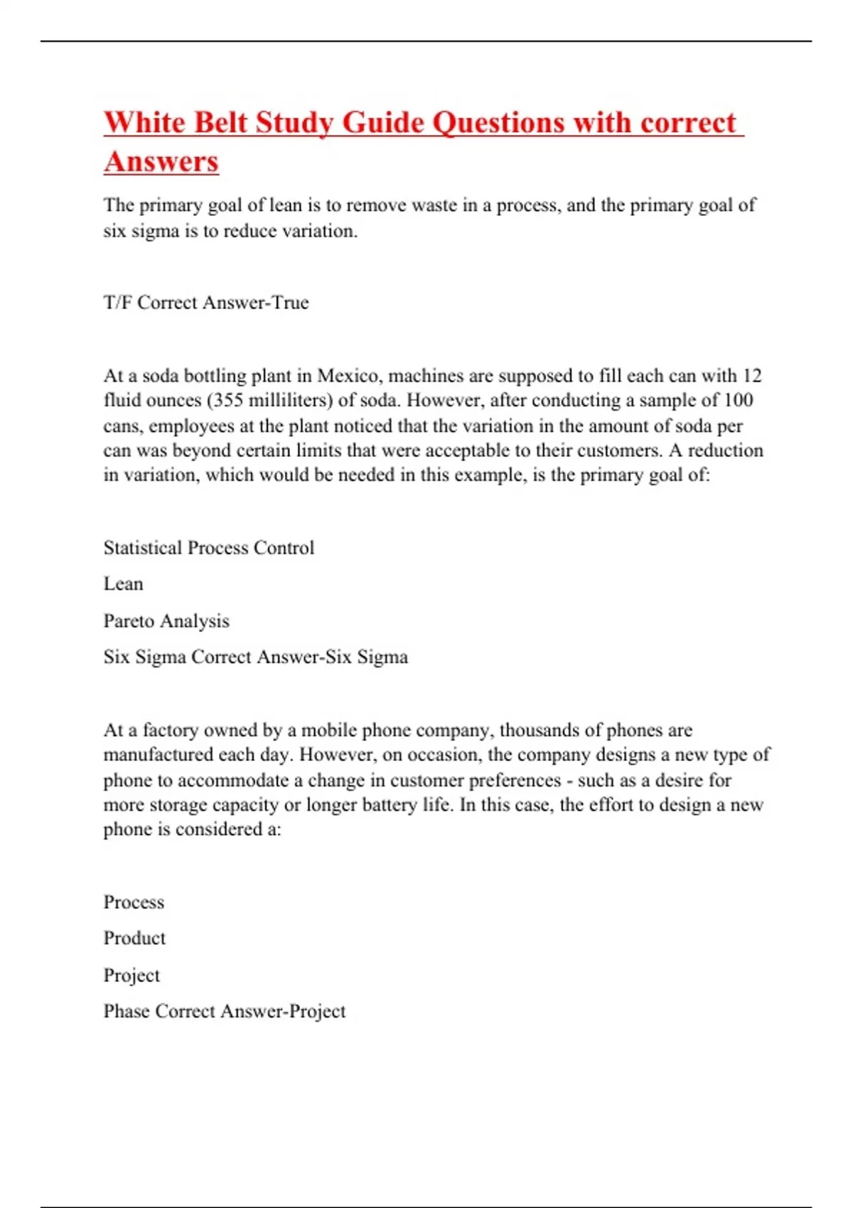The primary goal of lean is to remove waste in a process, and the primary goal of six sigma is to reduce variation. T/F Correct Answer-True At a soda bottling plant in Mexico, machines are supposed to fill each can with 12 fluid ounces (355 milliliters) of soda. However, after conducting a sample of 100 cans, employees at the plant noticed that the variation in the amount of soda per can was beyond certain limits that were acceptable to their customers. A reduction in variation, which would be needed in this example, is the primary goal of: Statistical Process Control Lean Pareto Analysis Six Sigma Correct Answer-Six Sigma At a factory owned by a mobile phone company, thousands of phones are manufactured each day. However, on occasion, the company designs a new type of phone to accommodate a change in customer preferences - such as a desire for more storage capacity or longer battery life. In this case, the effort to design a new phone is considered a: Process Product Project Phase Correct Answer-Project