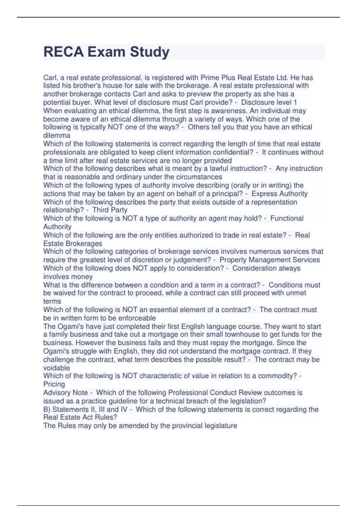 RECA Exam Study Carl, a real estate professional, is registered with Prime Plus Real Estate Ltd. He has listed his brother's house for sale with the brokerage. A real estate professional with another brokerage contacts Carl and asks to preview the property as she has a potential buyer. What level of disclosure must Carl provide? - Disclosure level 1 When evaluating an ethical dilemma, the first step is awareness. An individual may become aware of an ethical dilemma through a variety of ways. Which one of the following is typically NOT one of the ways? - Others tell you that you have an ethical dilemma Which of the following statements is correct regarding the length of time that real estate professionals are obligated to keep client information confidential? - It continues without a time limit after real estate services are no longer provided Which of the following describes what is meant by a lawful instruction? - Any instruction that is reasonable and ordinary under the circumstances Which of the following types of authority involve describing (orally or in writing) the actions that may be taken by an agent on behalf of a principal? - Express Authority Which of the following describes the party that exists outside of a representation relationship? - Third Party Which of the following is NOT a type of authority an agent may hold? - Functional Authority Which of the following are the only entities authorized to trade in real estate? - Real Estate Brokerages Which of the following categories of brokerage services involves numerous services that require the greatest level of discretion or judgement? - Property Management Services Which of the following does NOT apply to consideration? - Consideration always involves money What is the difference between a condition and a term in a contract? - Conditions must be waived for the contract to proceed, while a contract can still proceed with unmet terms Which of the following is NOT an essential element of a contract? - The contract must be in written form to be enforceable The Ogami's have just completed their first English language course. They want to start a family business and take out a mortgage on their small townhouse to get funds for the business. However the business fails and they must repay the mortgage. Since the Ogami's struggle with English, they did not understand the mortgage contract. If they challenge the contract, what term describes the possible result? - The contract may be voidable Which of the following is NOT characteristic of value in relation to a commodity? - Pricing Advisory Note - Which of the following Professional Conduct Review outcomes is issued as a practice guideline for a technical breach of the legislation? B) Statements II, III and IV - Which of the following statements is correct regarding the Real Estate Act Rules? The Rules may only be amended by the provincial legislature RECA posts the most current version of the Rules on its website