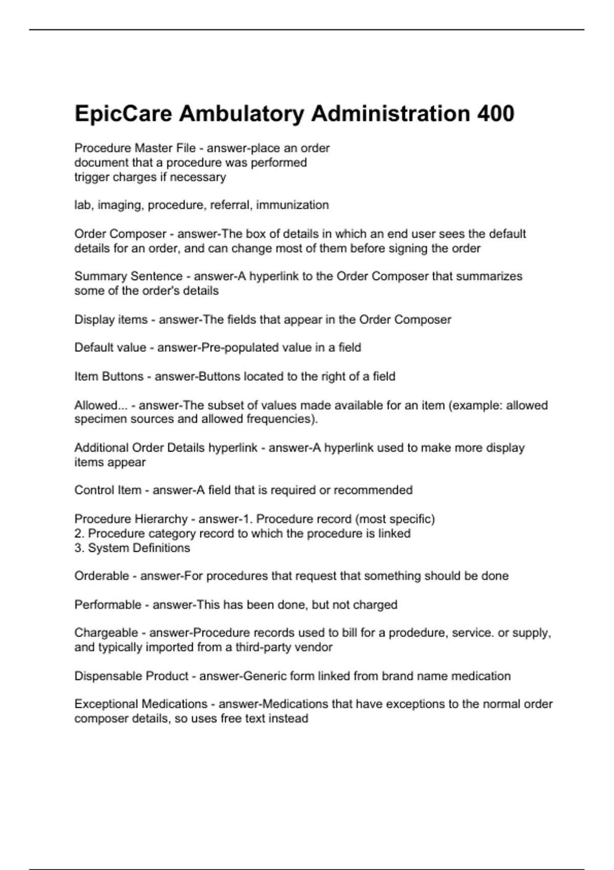Procedure Master File - answer-place an order document that a procedure was performed trigger charges if necessary lab, imaging, procedure, referral, immunization Order Composer - answer-The box of details in which an end user sees the default details for an order, and can change most of them before signing the order Summary Sentence - answer-A hyperlink to the Order Composer that summarizes some of the order's details Display items - answer-The fields that appear in the Order Composer Default value - answer-Pre-populated value in a field Item Buttons - answer-Buttons located to the right of a field Allowed... - answer-The subset of values made available for an item (example: allowed specimen sources and allowed frequencies). Additional Order Details hyperlink - answer-A hyperlink used to make more display items appear Control Item - answer-A field that is required or recommended