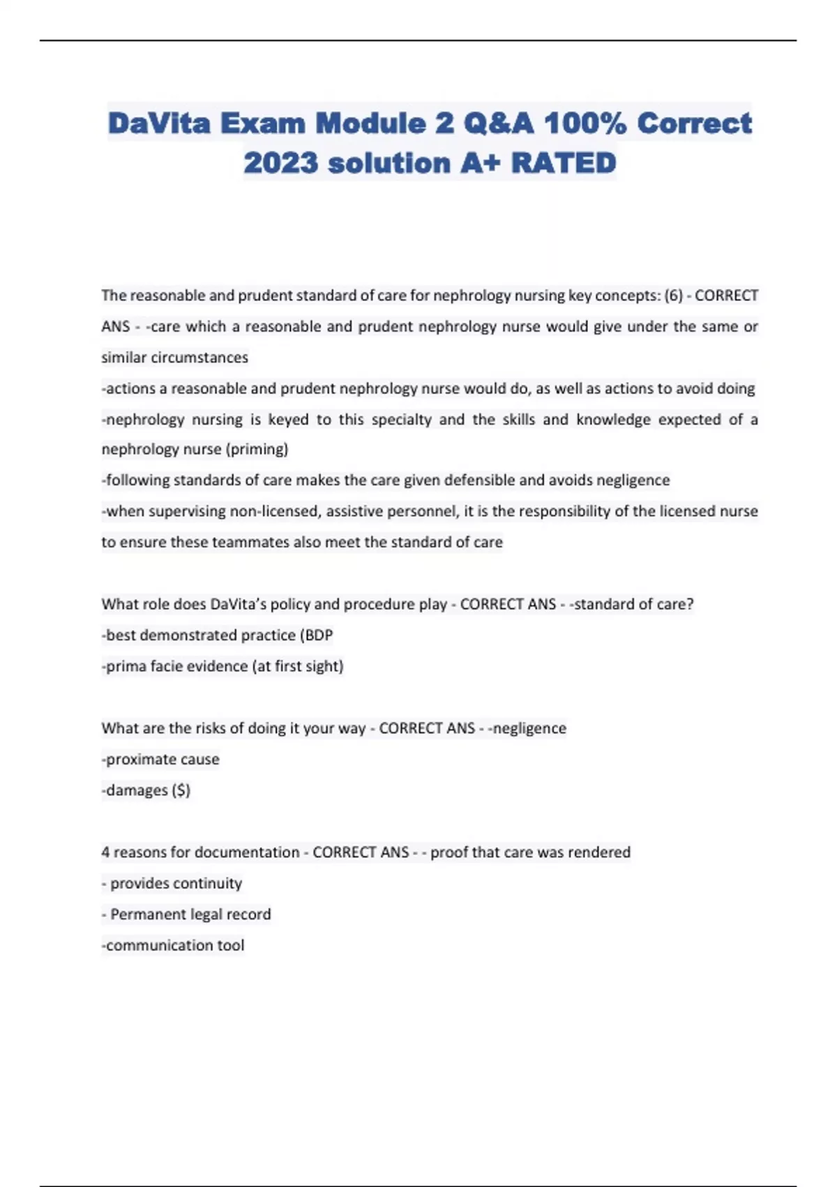 DaVita Exam Module 2 Q&A 100% Correct 2023 solution A+ RATED The reasonable and prudent standard of care for nephrology nursing key concepts: (6) - CORRECT ANS - -care which a reasonable and prudent nephrology nurse would give under the same or similar circumstances -actions a reasonable and prudent nephrology nurse would do, as well as actions to avoid doing -nephrology nursing is keyed to this specialty and the skills and knowledge expected of a nephrology nurse (priming) -following standards of care makes the care given defensible and avoids negligence -when supervising non-licensed, assistive personnel, it is the responsibility of the licensed nurse to ensure these teammates also meet the standard of care What role does DaVita’s policy and procedure play - CORRECT ANS - -standard of care? -best demonstrated practice (BDP -prima facie evidence (at first sight) What are the risks of doing it your way - CORRECT ANS - -negligence -proximate cause -damages ($) 4 reasons for documentation - CORRECT ANS - - proof that care was rendered - provides continuity - Permanent legal record -communication tool 6 occurrences when to chart? - CORRECT ANS - 1. baseline assessment change 2. change in condition 3. procedure or treatment 4. medication and response 5. patient teaching 6. care plan review and interventions What does smart communication stand for? - CORRECT ANS - S - simple M - meaningful A - actual R - read T - teach What is the difference between data collection and assessment - who does what? - CORRECT ANS - RNs do the assessments while PCTs or LVNs do the data collection part. What is the role of the licensed nurse prior to treatment initiation? - CORRECT ANS - Assessment: Listening to lung sounds and edema number scale What is the role of the PCT prior to treatment initiation? - CORRECT ANS - Machine setup, pre-treatment vitals, any concerns or changes in patient by asking them