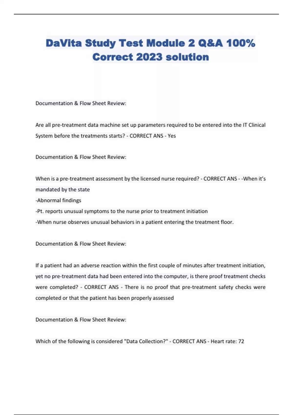 DaVita Study Test Module 2 Q&A 100% Correct 2023 solution Documentation & Flow Sheet Review: Are all pre-treatment data machine set up parameters required to be entered into the IT Clinical System before the treatments starts? - CORRECT ANS - Yes Documentation & Flow Sheet Review: When is a pre-treatment assessment by the licensed nurse required? - CORRECT ANS - -When it’s mandated by the state -Abnormal findings -Pt. reports unusual symptoms to the nurse prior to treatment initiation -When nurse observes unusual behaviors in a patient entering the treatment floor. Documentation & Flow Sheet Review: If a patient had an adverse reaction within the first couple of minutes after treatment initiation, yet no pre-treatment data had been entered into the computer, is there proof treatment checks were completed? - CORRECT ANS - There is no proof that pre-treatment safety checks were completed or that the patient has been properly assessed Documentation & Flow Sheet Review: Which of the following is considered "Data Collection?" - CORRECT ANS - Heart rate: 72 Data Collection & Assessment: What three symptoms would alert you that a patient's target weight may have to be increased? - CORRECT ANS - -Excessive cramping -Hypotension, -Dizziness -Skin turgor Data Collection & Assessment: What three symptoms would alert you that a patient's target weight may have to be decreased? - CORRECT ANS - -Hypertension -Peripheral Edema -Congestion in lungs -Neck vein distension
