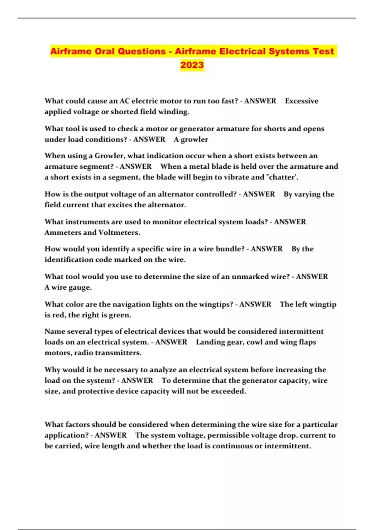 Airframe Oral Questions - Airframe Electrical Systems Test 2023