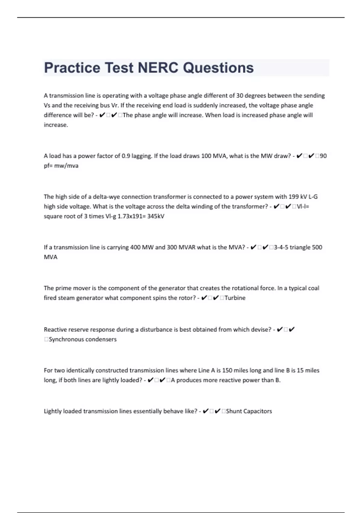 A transmission line is operating with a voltage phase angle different of 30 degrees between the sending Vs and the receiving bus Vr. If the receiving end load is suddenly increased, the voltage phase angle difference will be? - ️️The phase angle will increase. When load is increased phase angle will increase. A load has a power factor of 0.9 lagging. If the load draws 100 MVA, what is the MW draw? - ️️90 pf= mw/mva The high side of a delta-wye connection transformer is connected to a power system with 199 kV L-G high side voltage. What is the voltage across the delta winding of the transformer? - ️️Vl-l= square root of 3 times Vl-g 1.73x191= 345kV If a transmission line is carrying 400 MW and 300 MVAR what is the MVA? - ️️3-4-5 triangle 500 MVA The prime mover is the component of the generator that creates the rotational force. In a typical coal fired steam generator what component spins the rotor? - ️️Turbine Reactive reserve response during a disturbance is best obtained from which devise? - ️️Synchronous condensers For two identically constructed transmission lines where Line A is 150 miles long and line B is 15 miles long, if both lines are lightly loaded? - ️️A produces more reactive power than B. Lightly loaded transmission lines essentially behave like? - ️️Shunt Capacitors