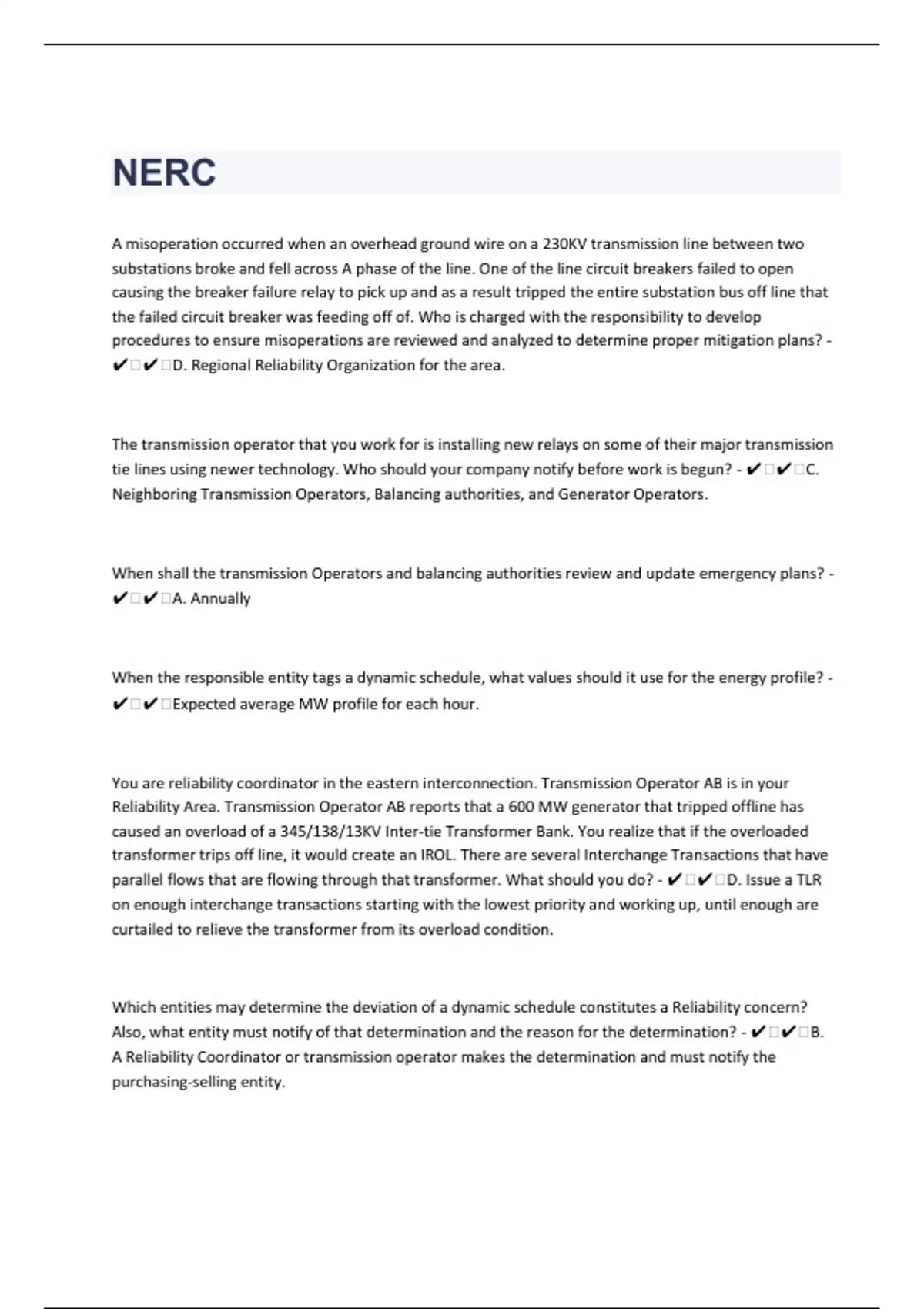 A misoperation occurred when an overhead ground wire on a 230KV transmission line between two substations broke and fell across A phase of the line. One of the line circuit breakers failed to open causing the breaker failure relay to pick up and as a result tripped the entire substation bus off line that the failed circuit breaker was feeding off of. Who is charged with the responsibility to develop procedures to ensure misoperations are reviewed and analyzed to determine proper mitigation plans? - ️️D. Regional Reliability Organization for the area. The transmission operator that you work for is installing new relays on some of their major transmission tie lines using newer technology. Who should your company notify before work is begun? - ️️C. Neighboring Transmission Operators, Balancing authorities, and Generator Operators. When shall the transmission Operators and balancing authorities review and update emergency plans? - ️️A. Annually When the responsible entity tags a dynamic schedule, what values should it use for the energy profile? - ️️Expected average MW profile for each hour. You are reliability coordinator in the eastern interconnection. Transmission Operator AB is in your Reliability Area. Transmission Operator AB reports that a 600 MW generator that tripped offline has caused an overload of a 345/138/13KV Inter-tie Transformer Bank. You realize that if the overloaded transformer trips off line, it would create an IROL. There are several Interchange Transactions that have parallel flows that are flowing through that transformer. What should you do? - ️️D. Issue a TLR on enough interchange transactions starting with the lowest priority and working up, until enough are curtailed to relieve the transformer from its overload condition. Which entities may determine the deviation of a dynamic schedule constitutes a Reliability concern? Also, what entity must notify of that determination and the reason for the determination? - ️️B. A Reliability Coordinator or transmission operator makes the determination and must notify the purchasing-selling entity.