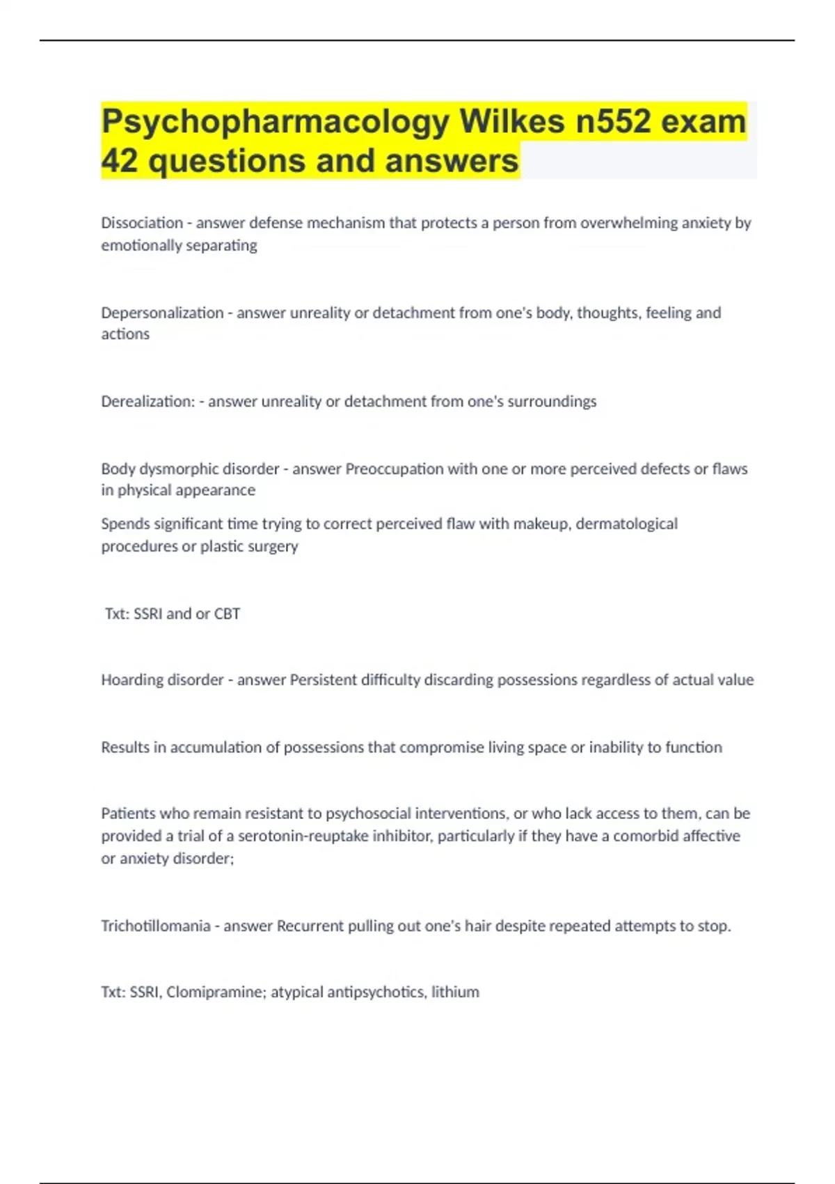 Dissociation defense mechanism that protects a person from overwhelming anxiety by emotionally separating Depersonalization unreality or detachment from one's body, thoughts, feeling and actions Derealization: unreality or detachment from one's surroundings Body dysmorphic disorder Preoccupation with one or more perceived defects or flaws in physical appearance Spends significant time trying to correct perceived flaw with makeup, dermatological procedures or plastic surgery Txt: SSRI and or CBT Hoarding disorder Persistent difficulty discarding possessions regardless of actual value Results in accumulation of possessions that compromise living space or inability to function Patients who remain resistant to psychosocial interventions, or who lack access to them, can be provided a trial of a serotonin-reuptake inhibitor, particularly if they have a comorbid affective or anxiety disorder; Trichotillomania Recurrent pulling out one's hair despite repeated attempts to stop. Txt: SSRI, Clomipramine; atypical antipsychotics, lithium Excoriation Disorder Recurrent skin picking that results in lesions despite attempts to stop. Cognitive-behavioral therapies may be beneficial for patients accepting psychiatric referral Txt: SSRIS, antipsychotics, anxiolytics Posttraumatic Stress Disorder (PTSD) Re-experiencing of an extremely traumatic event accompanied by symptoms of increased arousal and avoidance of stimuli associate with the trauma. PTSD treatment 1st line: SSRIS (Zoloft, Celexa) or SNRIS (Venlafaxine) FDA approved meds: Sertraline (Zoloft) and Paroxetine (Paxil) Alpha-1 agonist (Prazosin)= targets flashbacks; nightmares and hypervigilance Psychotherapy (CBC- exposure therapy etc.) • PTSD is a potentially debilitating disorder that can occurs after a traumatic event. Commonly described in war veterans • Can also present in those experiencing non- war events PTSD • Clinical syndrome is characterized by 4 clusters of symptoms: Re-experiencing the trauma (with intrusive thoughts, nightmares, or flashbacks) • Emotional numbing • Avoidance behaviors • Persistent hyperarousal and mood symptoms (depression, irritability, anger) Difference between Acute Stress Disorder and PTSD: When an individual experiences a traumatic event and displays anxiety symptoms that lasts for only a short duration, the condition is opposed to PTSD. For the diagnosed as ASD as condition to be diagnosed as ASD, symptoms must occur within one month of trauma and last for not more than one month. The symptoms of ASD, however, are similar to those observed in PTSD. Comorbidity Assessment: PTSD It is important to look for: Substance use disorders (avoid benzodiazepines) Depression Bipolar disorder Psychosis Nonpharmacologic Treatment in PTSD: СВТ Supportive Group Therapy Relaxation therapies Eye Movement Desensitization and Reprocessing (EMDR) ***Benzodiazepines may interfere with the psychological processes needed to benefit from СВТ PTSD patients experience insomnia? up to 90% experience insomnia PTSD and nightmares 70% experience more than 5 a week Sleep Assessment PTSD Sleep impairment is a core symptom of PTSD PTSD Common sleep disturbances include: hyperarousal linked to difficulties initiating or maintaining sleep, trauma-related nightmares, disturbed awakenings without nightmare recollection, prolonged sleep latency (often due to fear of nightmares) For many patients, improving sleep symptoms can improve core daytime PTSD symptoms (hypervigilance, avoidance, re-experiencing). Look for other causes of insomnia: sleep apnea, restless legs syndrome, periodic limb movements of sleep, sleep hygiene issues, excess caffeine consumption, medical problems PTSD Treatment: 1st Line **SSRIS are a first-line FDA recommended treatment: Paroxetine and Sertraline are FDA-approved From the FDA perspective, all other medication uses are "off label", though there are differ levels of evidence supporting their use. While SSRIS are typically the first class of medications used in PTSD treatment, exceptions may occur for patients based upon their individual histories of side effects, response, comorbidities, and personal preferences. PTSD Treatment: 2nd Line SNRI (Venlafaxine; Duloxetine) PTSD-related psychosis: Try SSRI first. If that doesn't help, add a second-generation antipsychotic like risperidone. PTSD: Sleep Disturbance Prazosin: • Increased noradrenergic activity during sleep is found in patients with PTSD (increased adrenaline; flight or fight). The adrenergic blockers, such as Prazosin, target the impaired sleep in PTSD patients. Reports exhibit improvement daytime symptoms of PTSD. • Used "off-label" for nightmares or disturbed awakenings. • Recommended for hyperarousal and nightmares in patients with PTSD. Should be titrated down when no longer needed because of the risk of rebound hypertension. PTSD: Sleep Disturbance off label Non-benzodiazepine hypnotics (Lunesta, etc.): No notable development in dependence or tolerance seen in studies up to 6 months. May be preferred over benzodiazepines because of the rapid onset, short duration of effect and safety profile. They generally do not affect REM sleep. Tricyclic antidepressants (weight gain), cardiac (not safe in case of overdose)- helps chronic pain and may be considered in (Doxepin, Amitriptyline)- Adverse effects: Anticholinergic, antihistaminic patients with chronic pain (migraines; nerve pain; etc.). Benzodiazepines. High potential for abuse in PTSD in patients with or without comorbid substance mususe. Not effective for primary PTSD symptoms. May reduce effectiveness of psychotherapies. Can cause rebound insomnia.