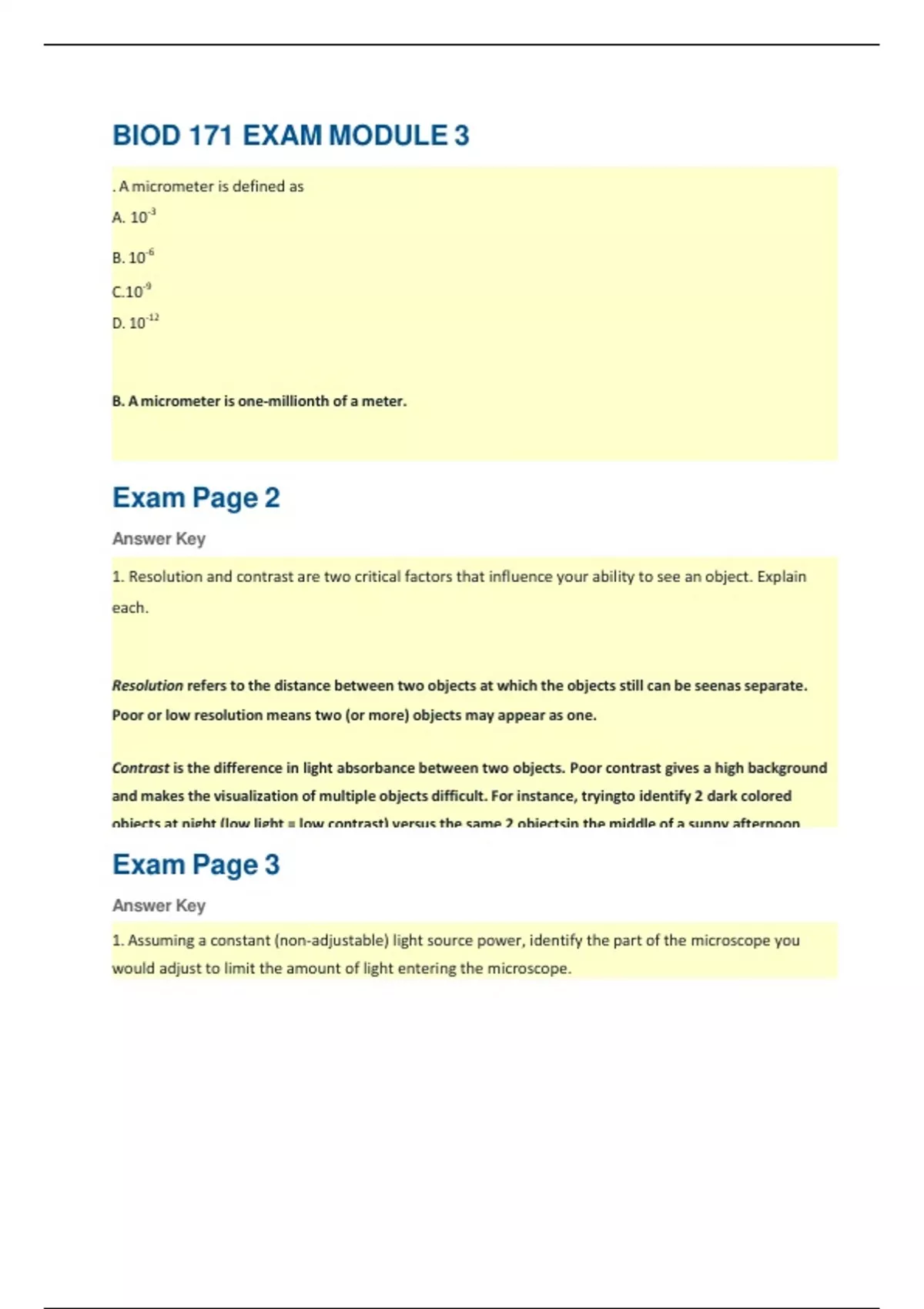 A micrometer is defined as A. 10-3 B. 10-6 C.10-9 D. 10-12 B. A micrometer is one-millionth of a meter. 2. True or False: A nanometer is longer than a micrometer. False. A nanometer is 1,000 times smaller than a micrometer. 1. Resolution and contrast are two critical factors that influence your ability to see an object. Explain each. Resolution refers to the distance between two objects at which the objects still can be seenas separate. Poor or low resolution means two (or more) objects may appear as one. Contrast is the difference in light absorbance between two objects. Poor contrast gives a high background and makes the visualization of multiple objects difficult. For instance, tryingto identify 2 dark colored objects at night (low light = low contrast) versus the same 2 objectsin the middle of a sunny afternoon (bright light against 2 dark objects = high contrast). 1. Assuming a constant (non-adjustable) light source power, identify the part of the microscope you would adjust to limit the amount of light entering the microscope.