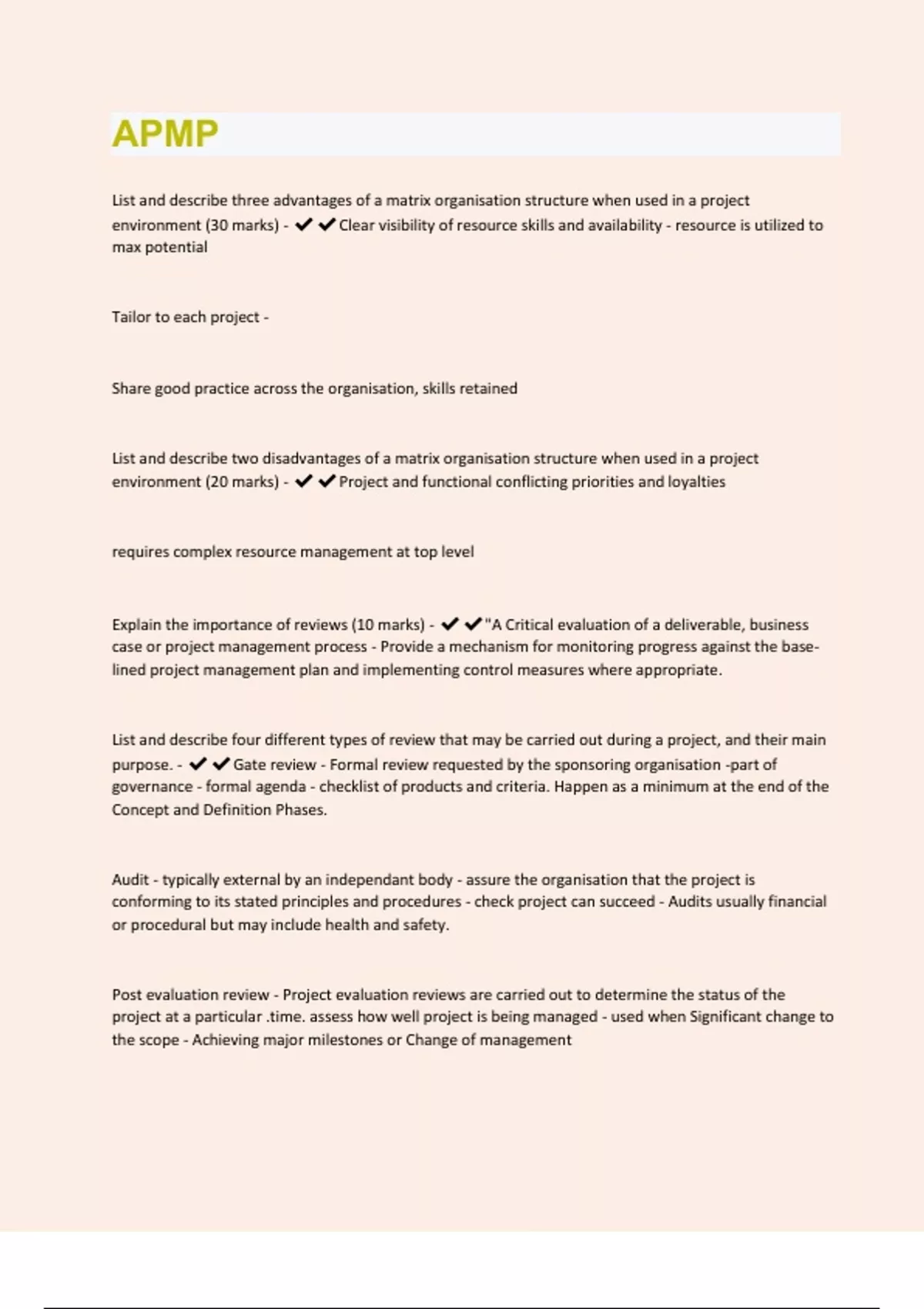 List and describe three advantages of a matrix organisation structure when used in a project environment (30 marks) - Clear visibility of resource skills and availability - resource is utilized to max potential Tailor to each project - Share good practice across the organisation, skills retained List and describe two disadvantages of a matrix organisation structure when used in a project environment (20 marks) - Project and functional conflicting priorities and loyalties requires complex resource management at top level Explain the importance of reviews (10 marks) - "A Critical evaluation of a deliverable, business case or project management process - Provide a mechanism for monitoring progress against the baselined project management plan and implementing control measures where appropriate. List and describe four different types of review that may be carried out during a project, and their main purpose. - Gate review - Formal review requested by the sponsoring organisation -part of governance - formal agenda - checklist of products and criteria. Happen as a minimum at the end of the Concept and Definition Phases. Audit - typically external by an independant body - assure the organisation that the project is conforming to its stated principles and procedures - check project can succeed - Audits usually financial or procedural but may include health and safety. Post evaluation review - Project evaluation reviews are carried out to determine the status of the project at a particular .time. assess how well project is being managed - used when Significant change to the scope - Achieving major milestones or Change of managementPeer review - typically formal or informal - conducted by someone of appropriate skills/experience - a resource from another function to provide objective opinion List and describe five activities which the project sponsor performs during the project life cycle (50 marks) - Owns the business case, delivers benefits to user, primary risk taker, approves budget, manages issues