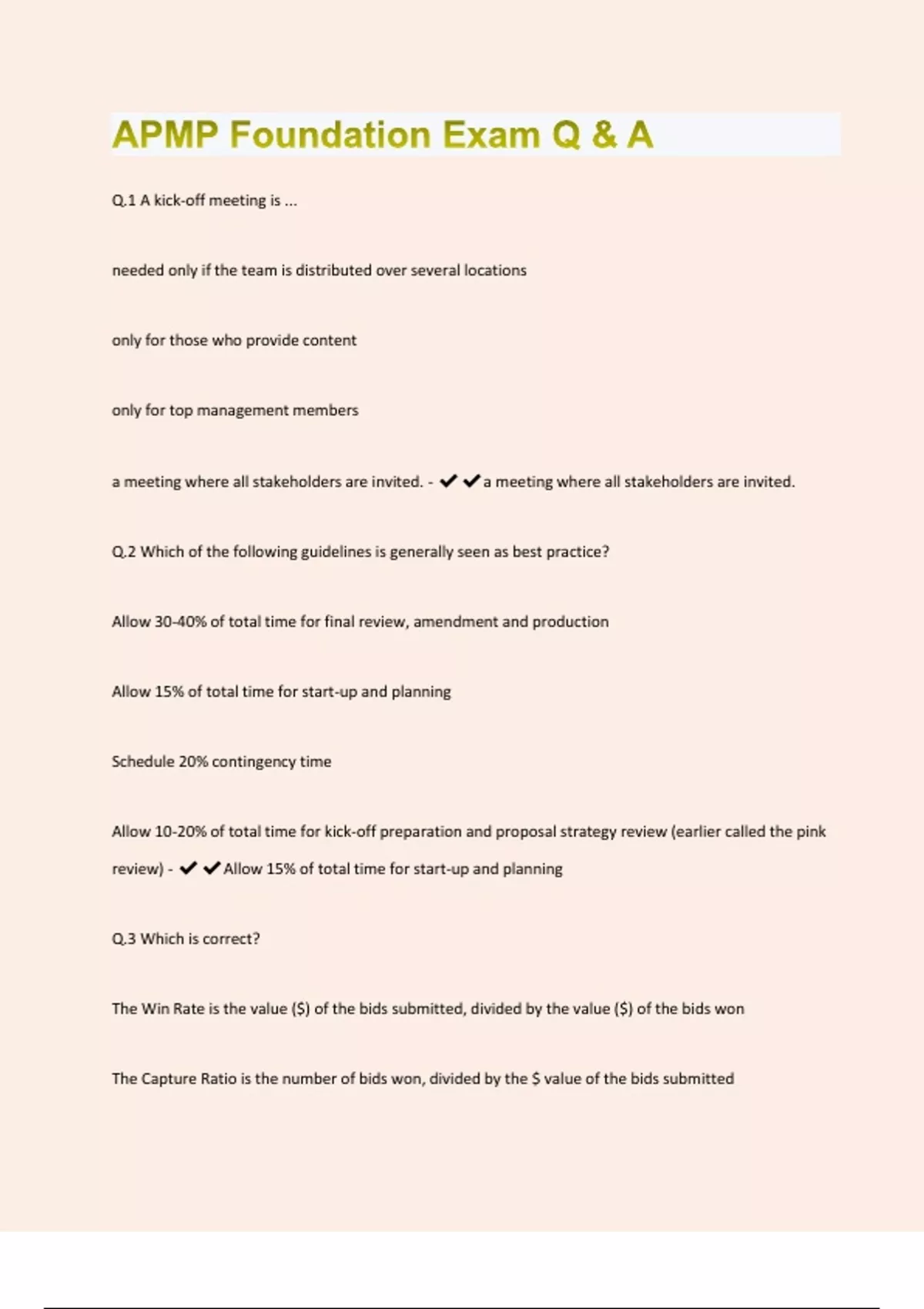 Q.1 A kick-off meeting is ... needed only if the team is distributed over several locations only for those who provide content only for top management members a meeting where all stakeholders are invited. - a meeting where all stakeholders are invited. Q.2 Which of the following guidelines is generally seen as best practice? Allow 30-40% of total time for final review, amendment and production Allow 15% of total time for start-up and planning Schedule 20% contingency time Allow 10-20% of total time for kick-off preparation and proposal strategy review (earlier called the pink review) - Allow 15% of total time for start-up and planning Q.3 Which is correct? The Win Rate is the value ($) of the bids submitted, divided by the value ($) of the bids won The Capture Ratio is the number of bids won, divided by the $ value of the bids submittedThe Capture Ratio is the value ($) of the bids submitted, divided by the number of bids won The Win Rate is the number of bids won, divided by the number of bids submitted - The Win Rate is the number of bids won, divided by the number of bids submitted Q.4 To produce a complex graphic, it typically needs 20 minutes each 1 hour each 2—6 hours each 1 day each - 2—6 hours each