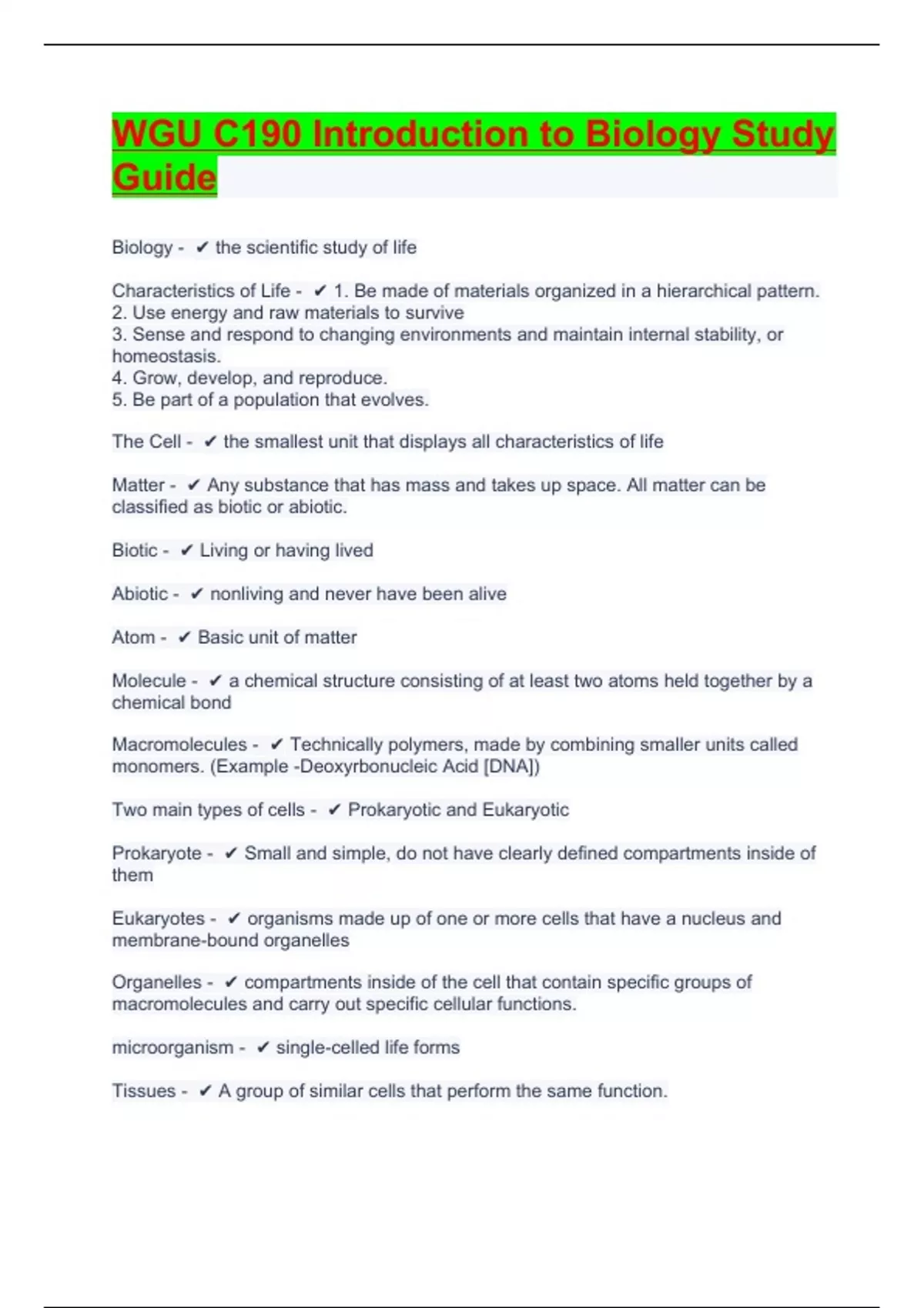 WGU C190 Introduction to Biology Study Guide.