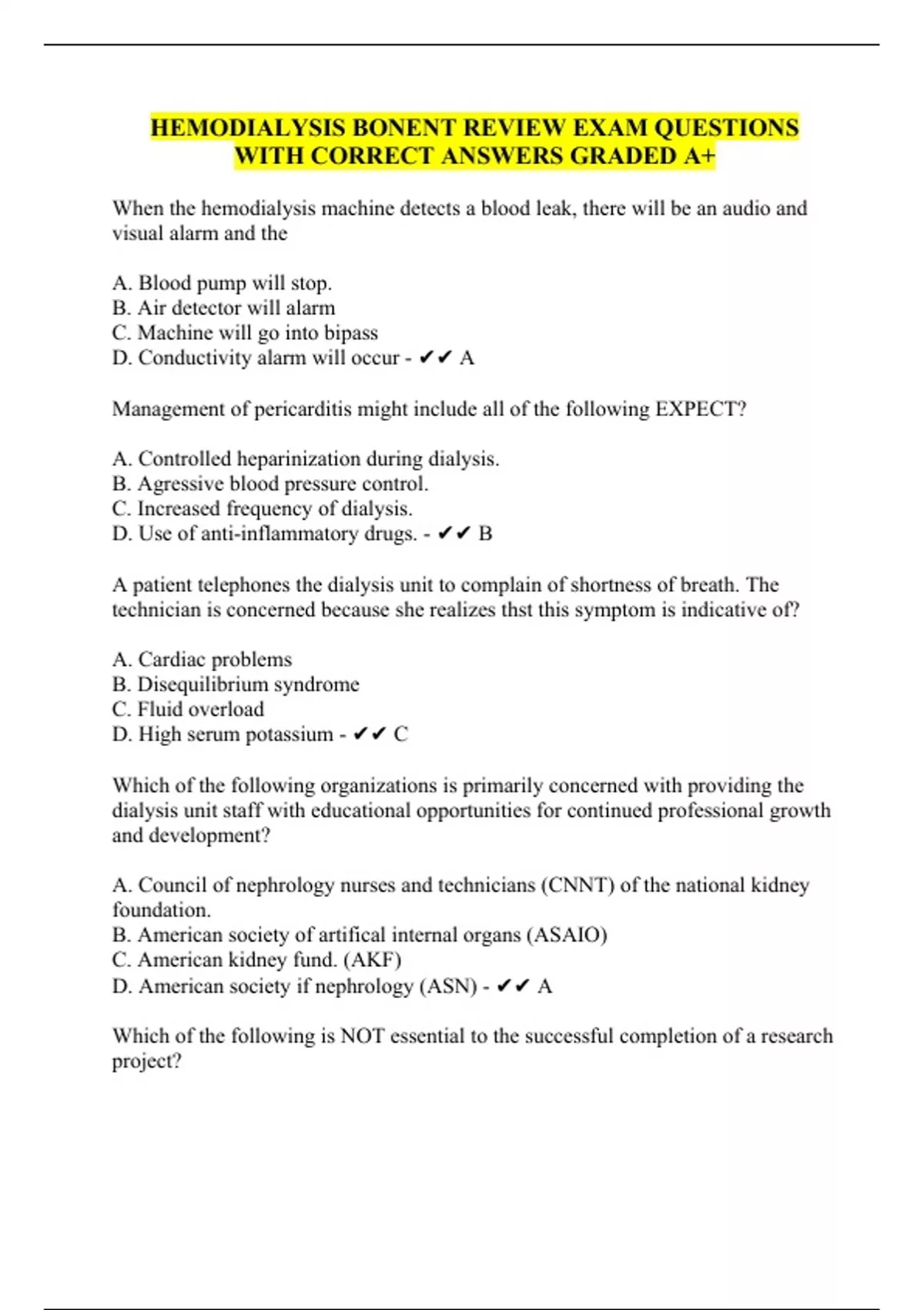 HEMODIALYSIS BONENT REVIEW EXAM QUESTIONS WITH CORRECT ANSWERS GRADED A+