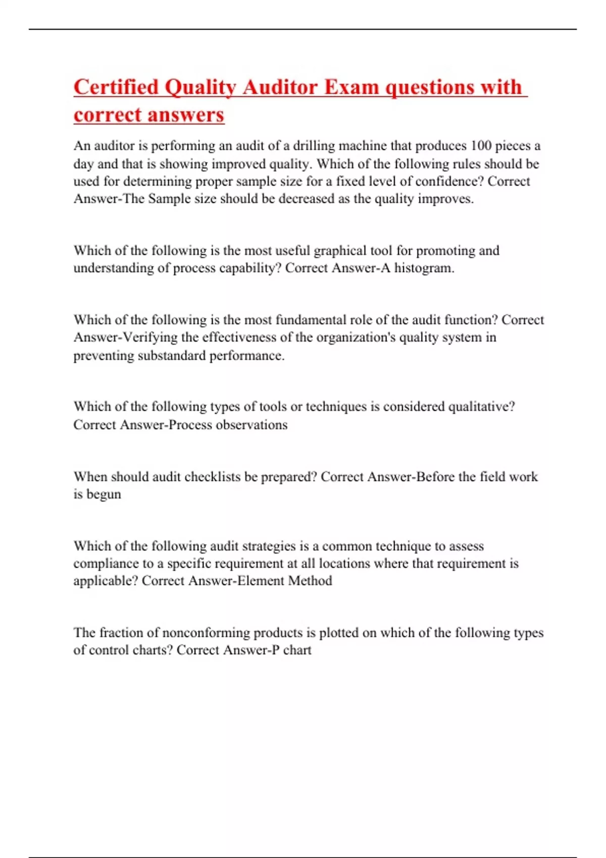 An auditor is performing an audit of a drilling machine that produces 100 pieces a day and that is showing improved quality. Which of the following rules should be used for determining proper sample size for a fixed level of confidence? Correct Answer-The Sample size should be decreased as the quality improves. Which of the following is the most useful graphical tool for promoting and understanding of process capability? Correct Answer-A histogram. Which of the following is the most fundamental role of the audit function? Correct Answer-Verifying the effectiveness of the organization's quality system in preventing substandard performance. Which of the following types of tools or techniques is considered qualitative? Correct Answer-Process observations When should audit checklists be prepared? Correct Answer-Before the field work is begun Which of the following audit strategies is a common technique to assess compliance to a specific requirement at all locations where that requirement is applicable? Correct Answer-Element Me