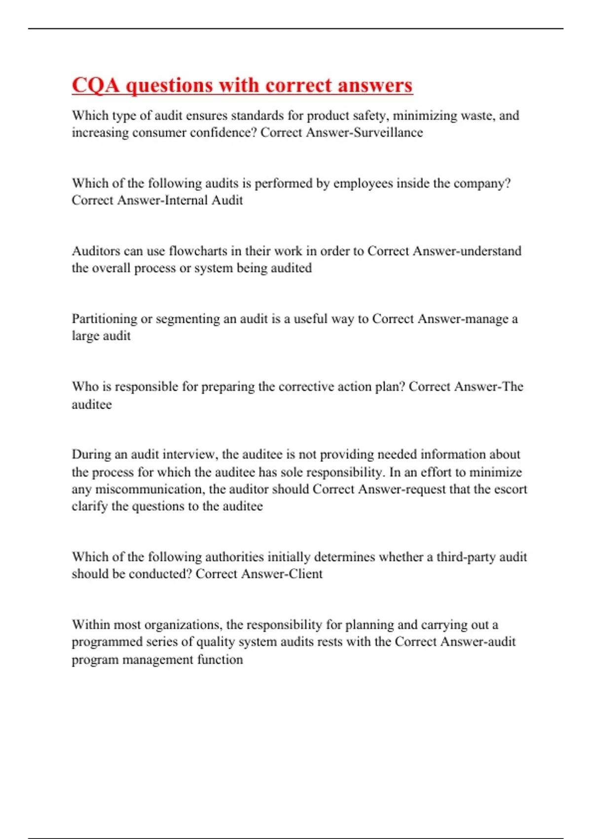 Which type of audit ensures standards for product safety, minimizing waste, and increasing consumer confidence? Correct Answer-Surveillance Which of the following audits is performed by employees inside the company? Correct Answer-Internal Audit Auditors can use flowcharts in their work in order to Correct Answer-understand the overall process or system being audited Partitioning or segmenting an audit is a useful way to Correct Answer-manage a large audit Who is responsible for preparing the corrective action plan? Correct Answer-The auditee During an audit interview, the auditee is not providing needed information about the process for which the auditee has sole responsibility. In an effort to minimize any miscommunication, the auditor should Correct Answer-request that the escort clarify the questions to the auditee
