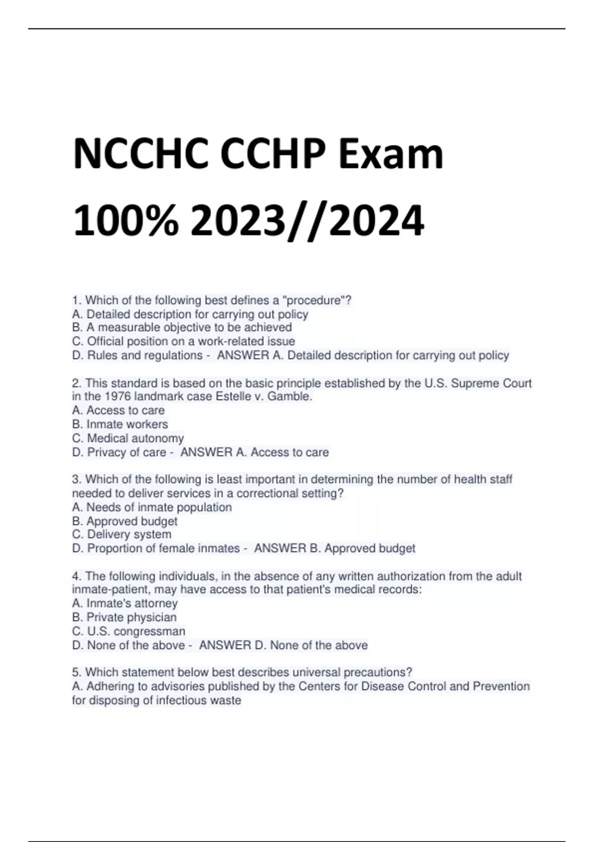 NCCHC CCHP Exam 100% 2023//2024 1. Which of the following best defines a "procedure"? A. Detailed description for carrying out policy B. A measurable objective to be achieved C. Official position on a work-related issue D. Rules and regulations - ANSWER A. Detailed description for carrying out policy 2. This standard is based on the basic principle established by the U.S. Supreme Court in the 1976 landmark case Estelle v. Gamble. A. Access to care B. Inmate workers C. Medical autonomy D. Privacy of care - ANSWER A. Access to care 3. Which of the following is least important in determining the number of health staff needed to deliver services in a correctional setting? A. Needs of inmate population B. Approved budget C. Delivery system D. Proportion of female inmates - ANSWER B. Approved budget 4. The following individuals, in the absence of any written authorization from the adult inmate-patient, may have access to that patient's medical records: A. Inmate's attorney B. Private physician C. U.S. congressman D. None of the above - ANSWER D. None of the above 5. Which statement below best describes universal precautions? A. Adhering to advisories published by the Centers for Disease Control and Prevention for disposing of infectious wast
