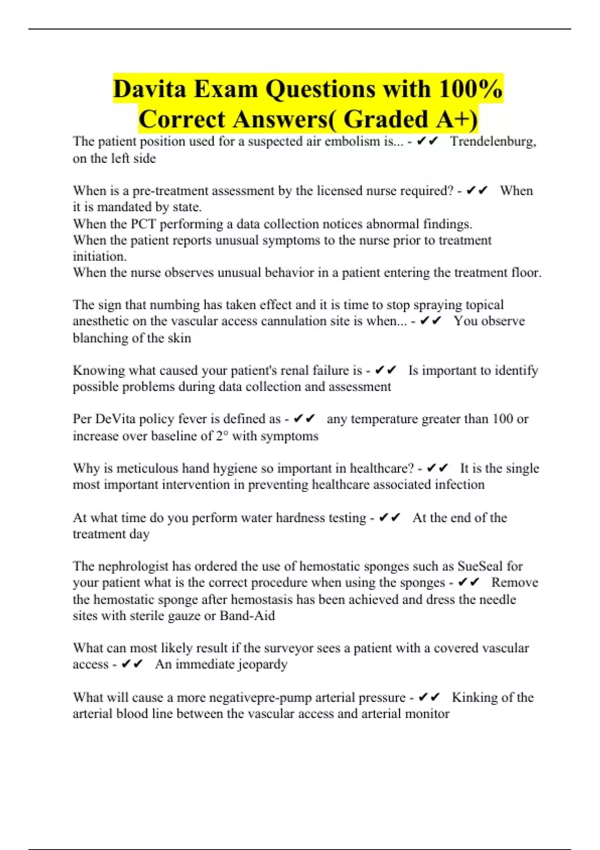 Davita Exam Questions with 100% Correct Answers( Graded A+)