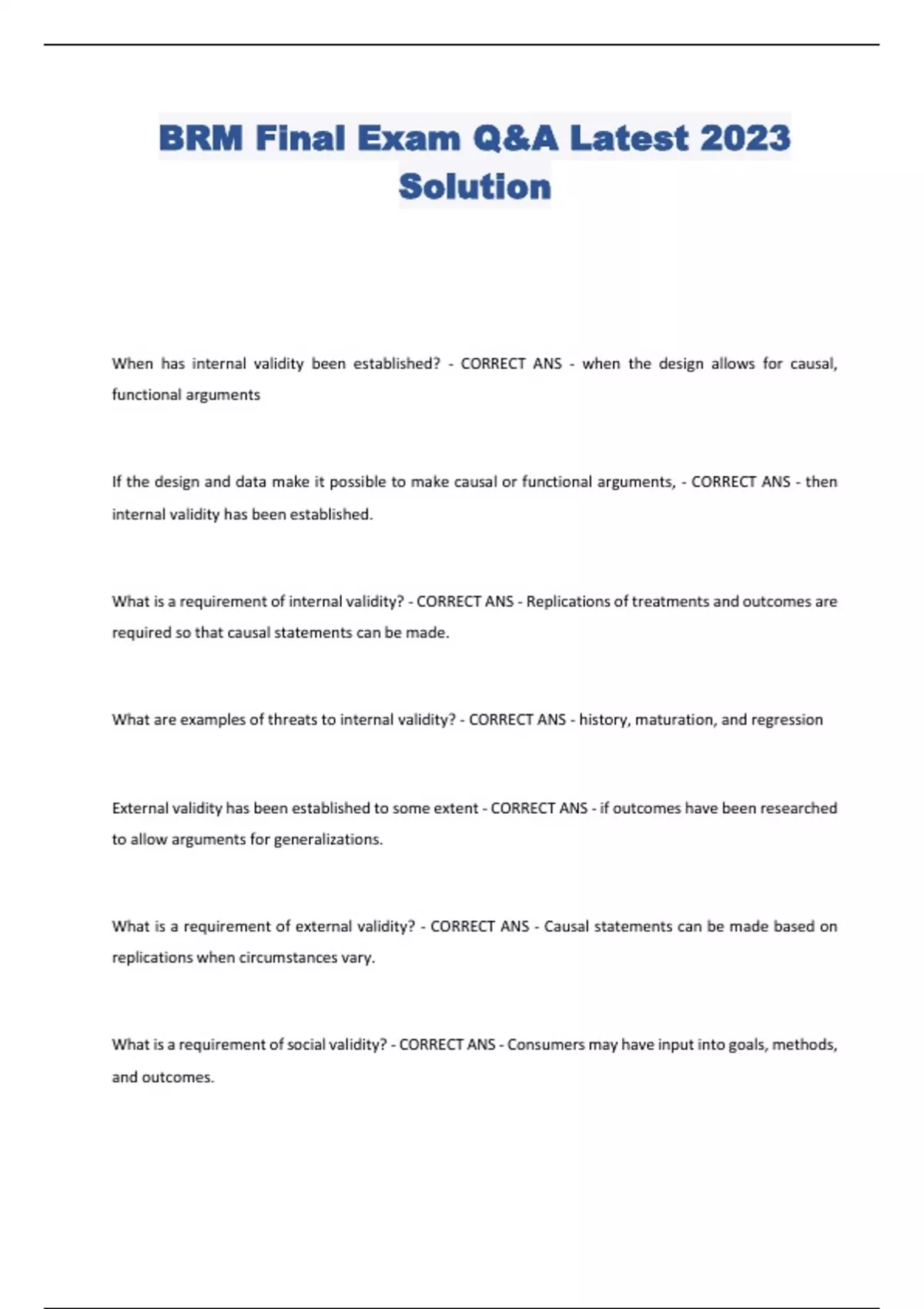 BRM Final Exam Q&A Latest 2023 Solution When has internal validity been established? - CORRECT ANS - when the design allows for causal, functional arguments If the design and data make it possible to make causal or functional arguments, - CORRECT ANS - then internal validity has been established. What is a requirement of internal validity? - CORRECT ANS - Replications of treatments and outcomes are required so that causal statements can be made. What are examples of threats to internal validity? - CORRECT ANS - history, maturation, and regression External validity has been established to some extent - CORRECT ANS - if outcomes have been researched to allow arguments for generalizations. What is a requirement of external validity? - CORRECT ANS - Causal statements can be made based on replications when circumstances vary. What is a requirement of social validity? - CORRECT ANS - Consumers may have input into goals, methods, and outcomes. In single case research, it is not about statistical significance, internal validity arguments and social validity of change both contribute to - CORRECT ANS - strength of findings