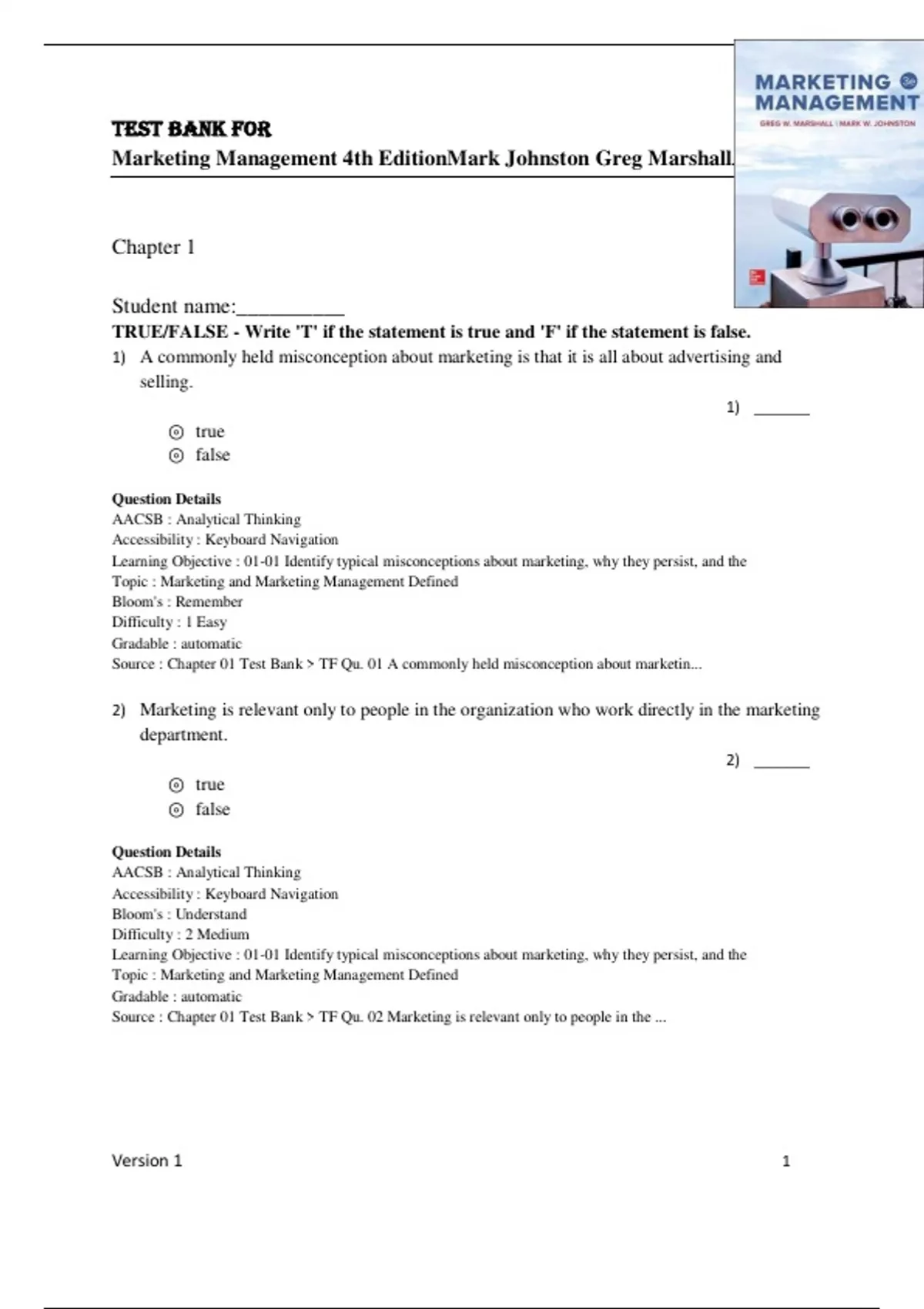 Test Bank Marketing Management, 3rd Edition Greg Marshall Mark Johnston