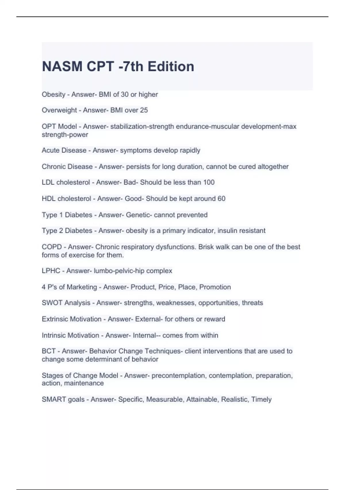 NASM CPT -7th Edition Exam Questions and Answers